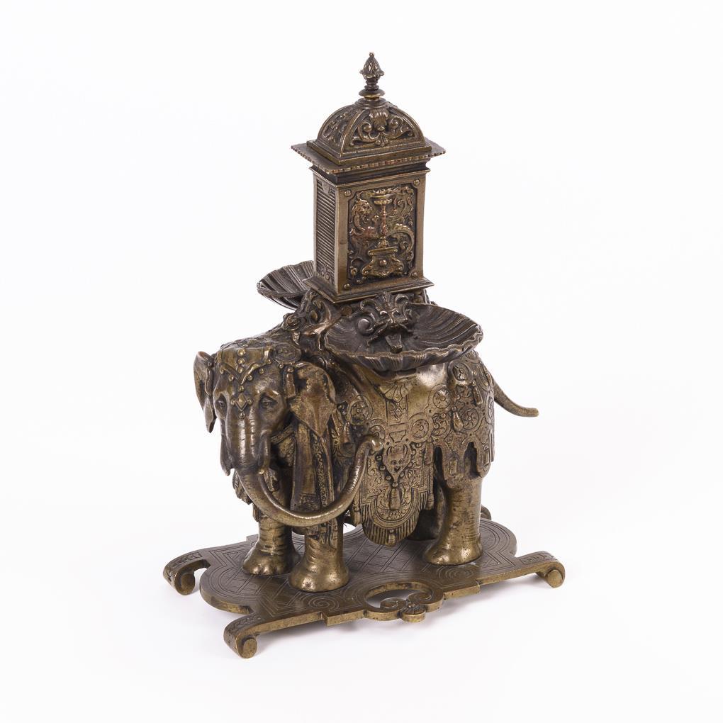 Auf teppichartiger Bronze-Plinthe stehender, prächtig geschmückter Elefant mit turmartigem Streichholzhalter und seitlichen Muschelschalen. Lötstelle am Rüsselansatz.