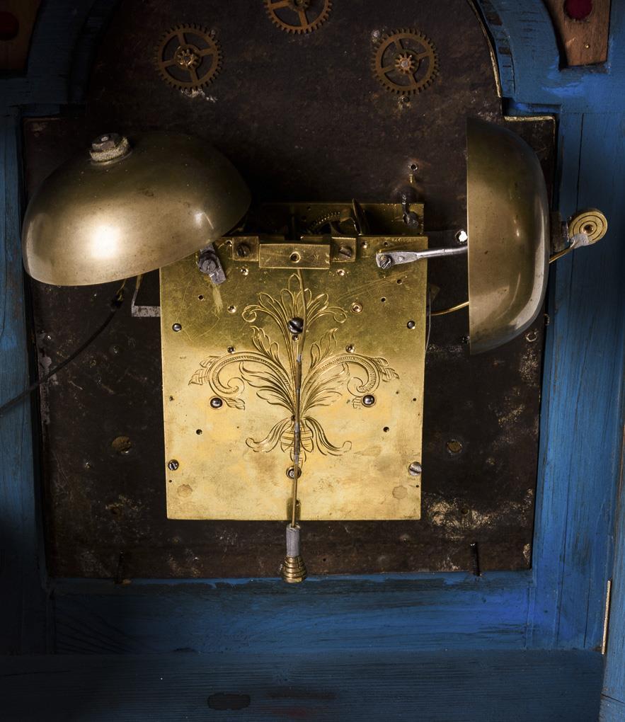 4-seitig verglaste Stutzuhr mit Rundbogenfeld und bekrönendem Zierbügel. Restauriert, Reparaturen, Ergänzungen, goldberieben.
