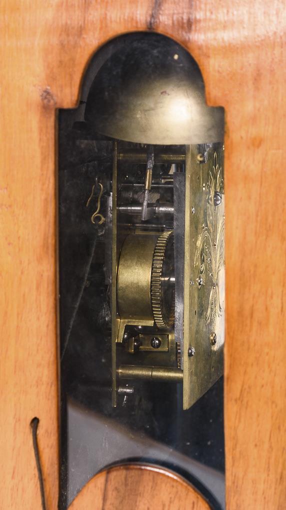 Floral graviertes Messingwerk mit Spindelgang und Viertelstundenschlag auf 2 Glocken, Kuhschwanzpendel. Läuft an, revisionsbedürftig. Messingfront mit weißem Emailzifferblatt, arabischen Zahlen, Minutenkranz und Louis Seize-Zeigern. Bogenfeld mit Hilfsblättern für Schlag und Repetition (Stellung defekt), 1 Blatt graviert "François Hochenadl, Vienne".