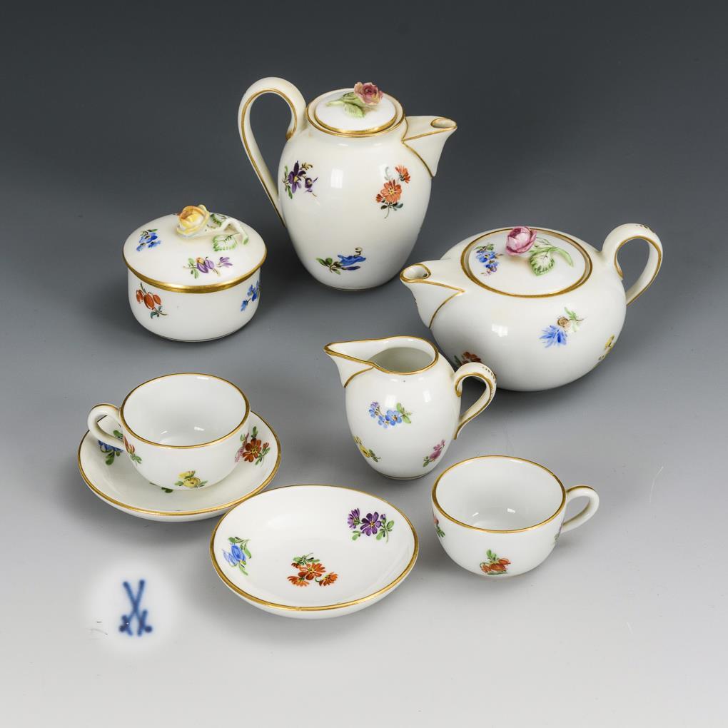 8 Teile. Glatte Form mit Streublümchenmalerei. Kaffeekännchen (H 7,5 cm), Teekännchen (H 5 cm), Milchkännchen, Zuckerdöschen, 2 Tässchen und 2 Untertässchen. 1x Rosenknauf bestoßen, 2 Bestoßungen am Innenrand des Teekännchens.