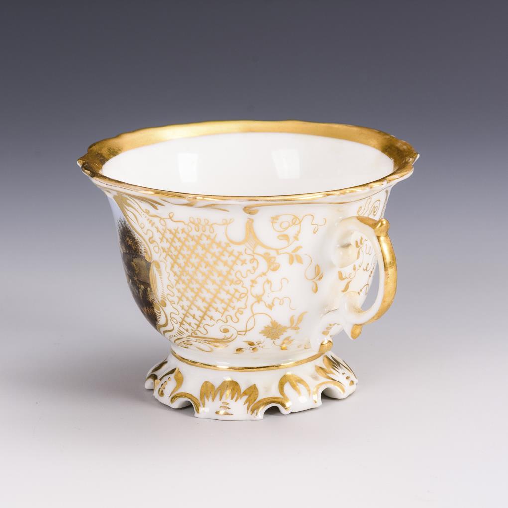 Gefußte Glockentasse. Schauseitig die Darstellung einer Flusslandschaft mit Burg/Kloster. Ohne Untertasse.