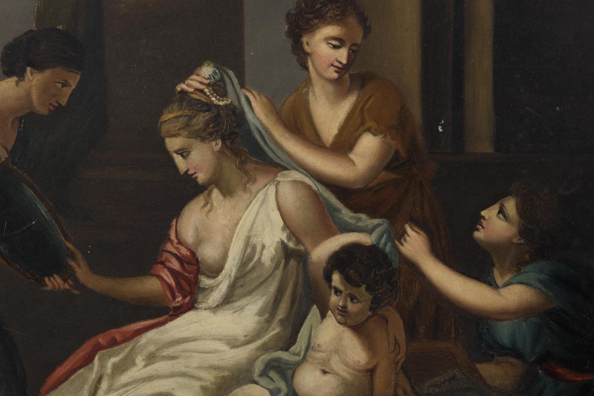 Die Göttin beim Blick in den Spiegel, daneben der Amorknabe und die Diener. Leichte Altersspuren.