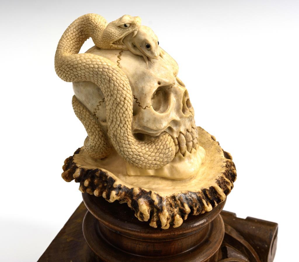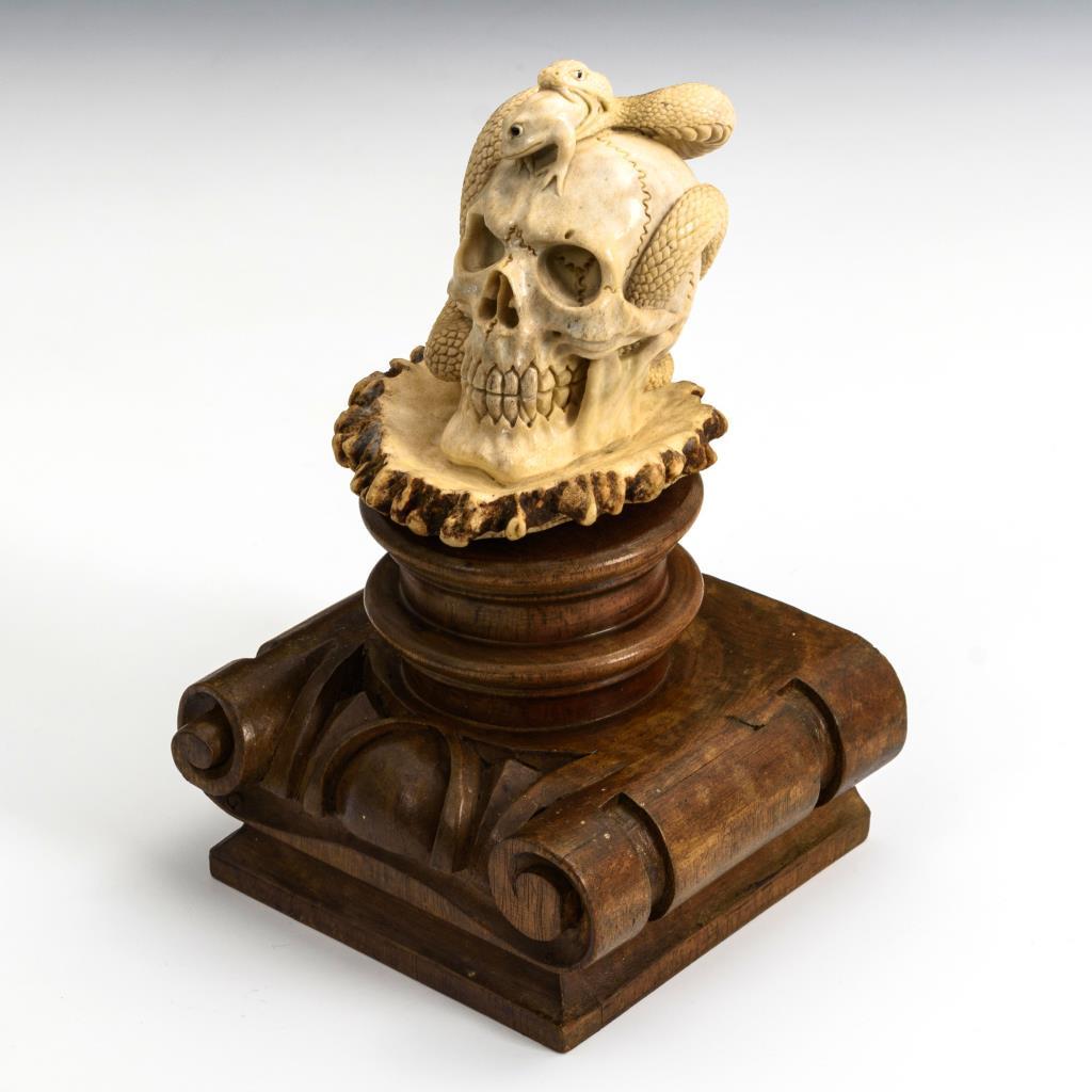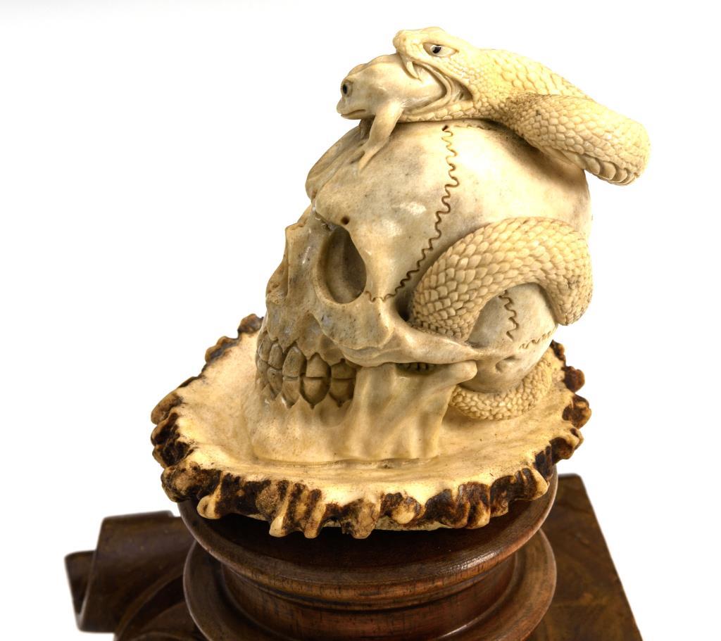 Zusammen mit der großen Hirschrose aus einem Stück geschnitzter Vanitas-Schädel mit Schlange und Frosch. Geringe Fehlstelle am Holzsockel.