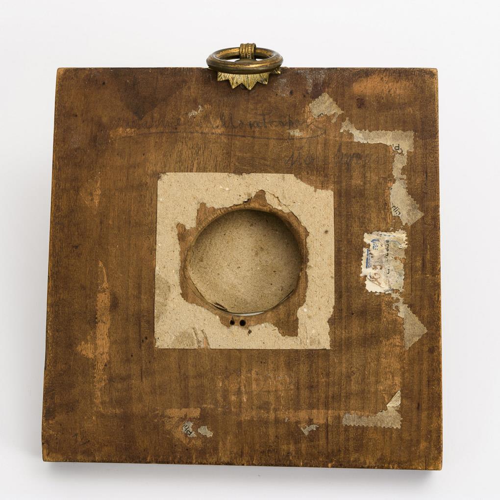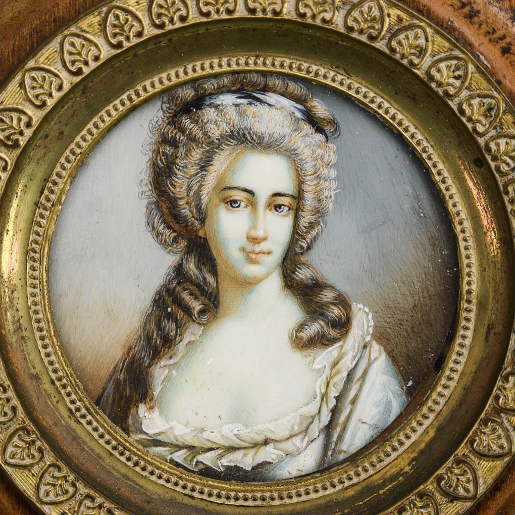 Wohl Tempera/Elfenbein, weiß gehöht, verso Madame de Montespan betitelt. Ø 5 cm, verglaster Holzrahmen mit Messing-Appliken 16 x 17 cm.