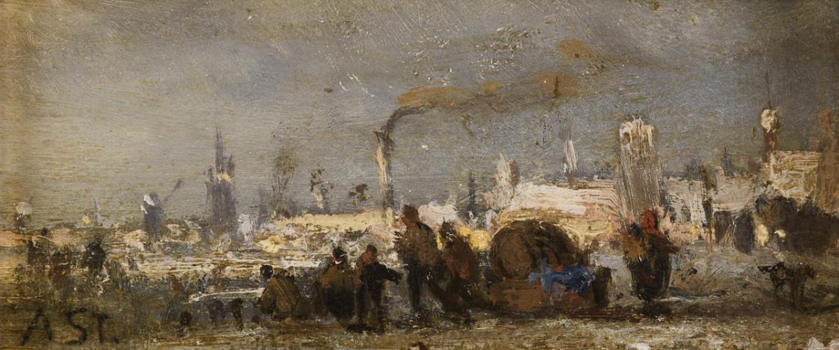 Staffagefiguren nahe einer Stadt im Sonnenschein.
