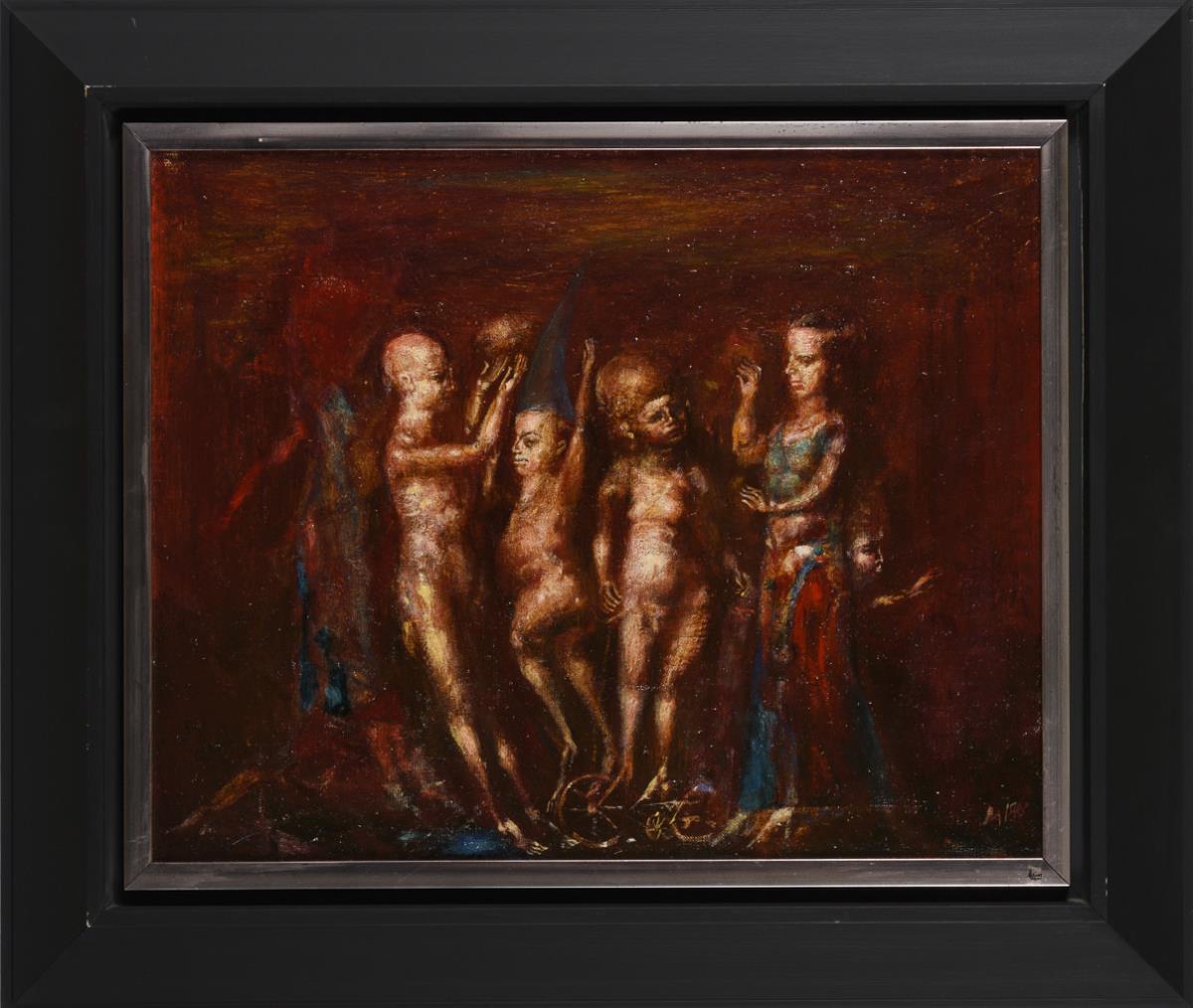 Surrealistische Szene mit nackten Personen in roter Umgebung.