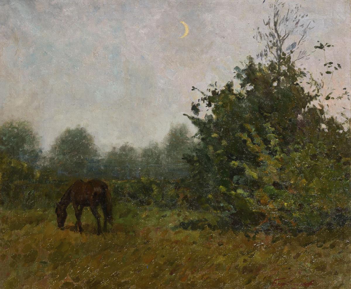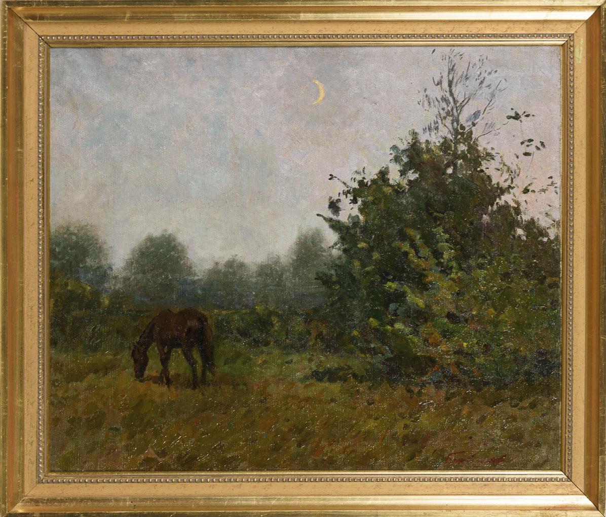 Wiese nahe einem Wäldchen mit einem Pferd unter der Mondsichel. Leichte Altersspuren.