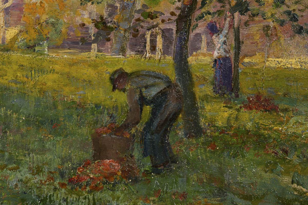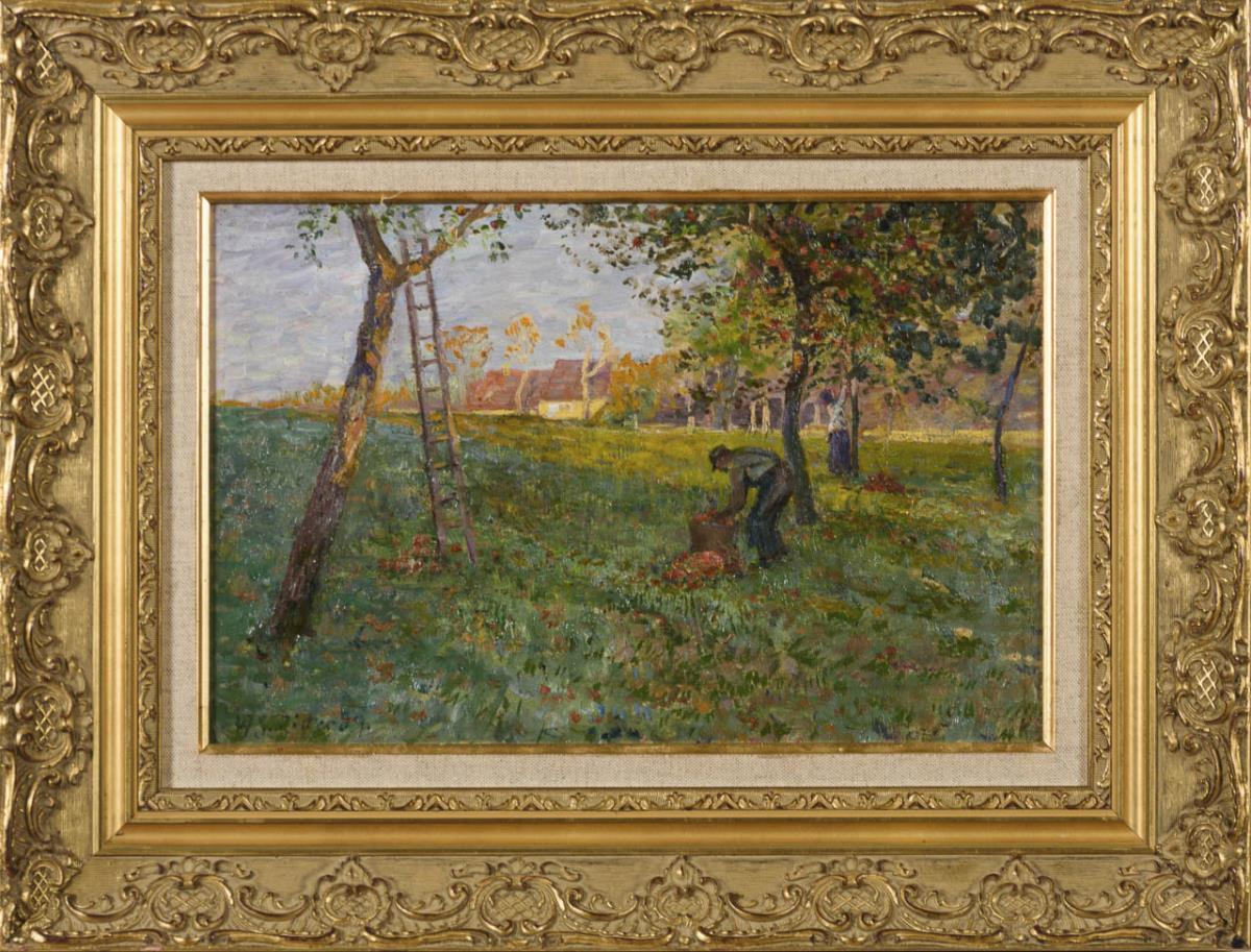 Bauernpaar bei der Apfelernte auf der Obstwiese am Morgen.