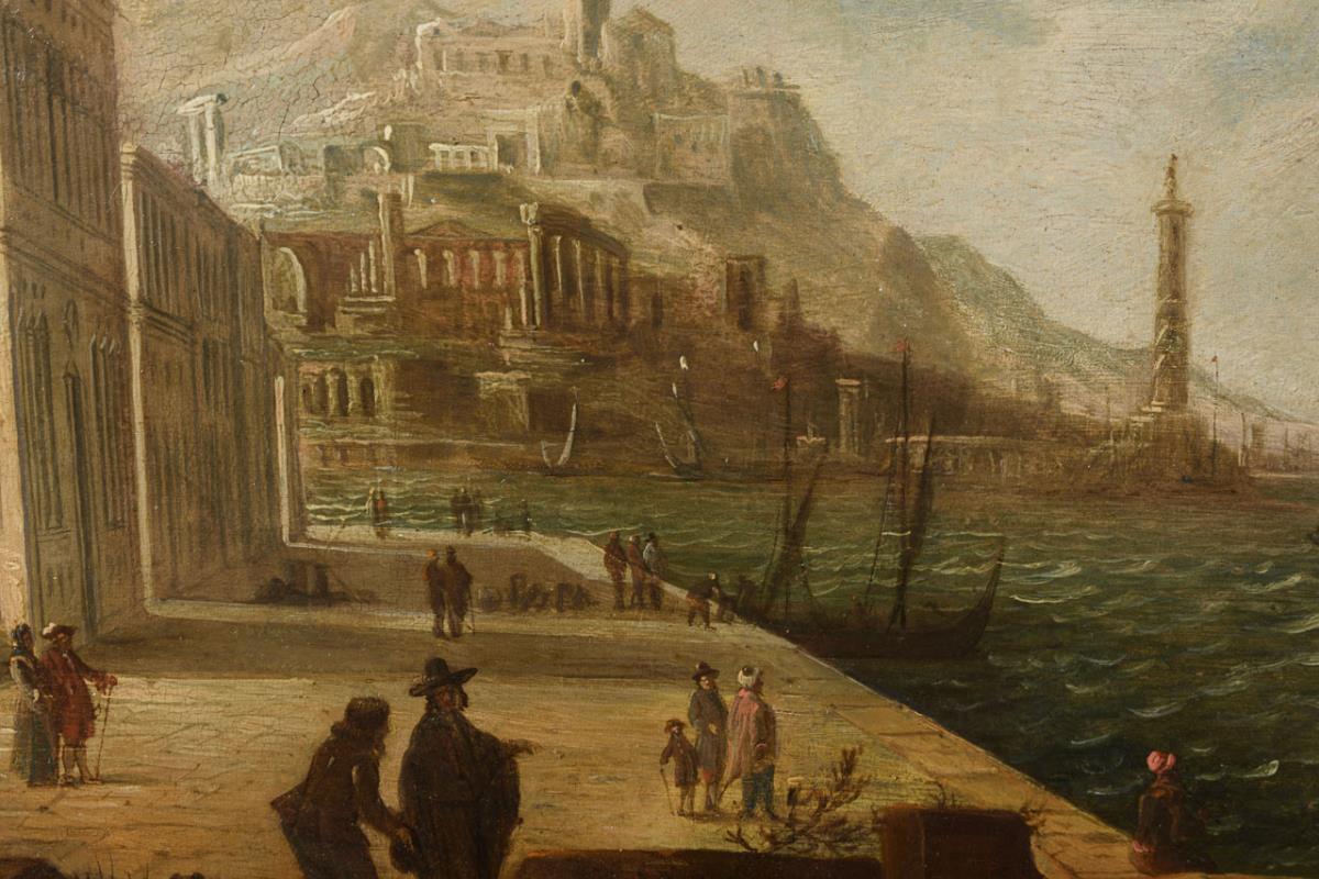 Südlicher Hafen mit viel Personenstaffage nahe dem Ufer mit den nahenden Schiffen im Sonnenschein. Retuschiert.
