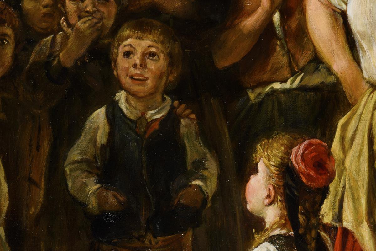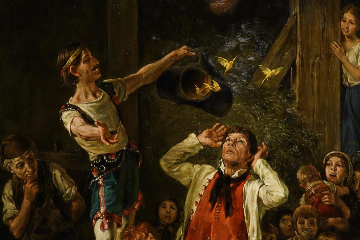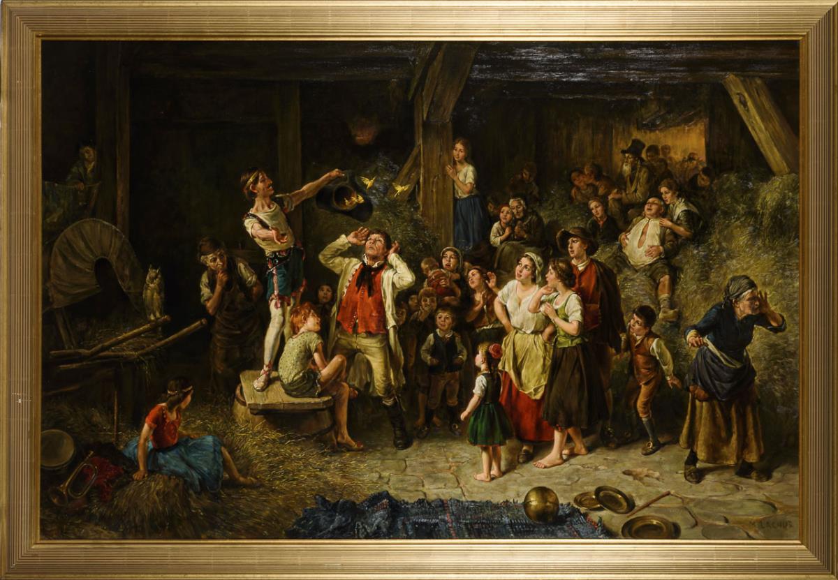 Großes Erstaunen in der Scheune beim Publikum, während der Schausteller die Paradiesvögel aus seinem Hut zaubert.