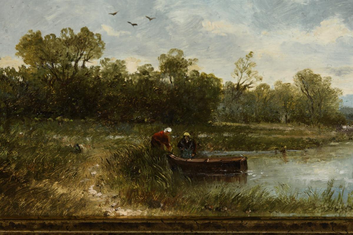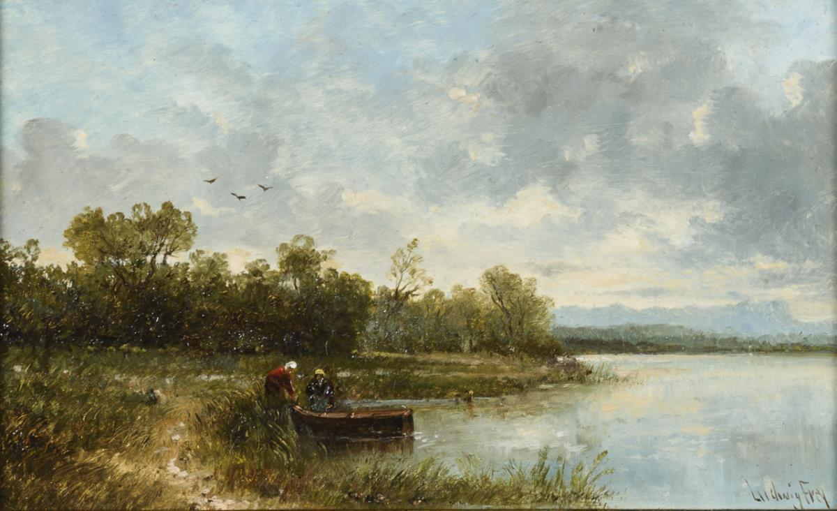 Fischer am Ufer mit dem Kahn unter leicht bewölktem Himmel.