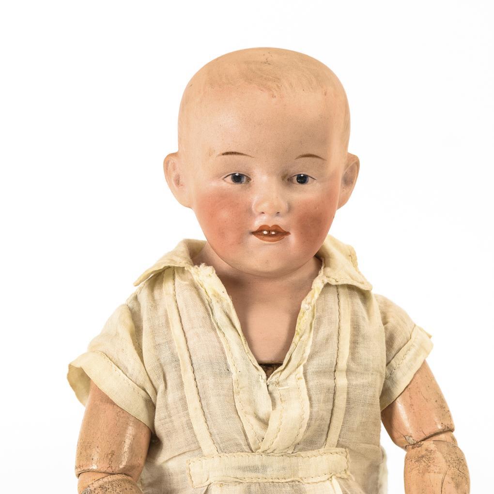 Vollkopf mit modellierten Haaren und gemalten blauen Intaglio-Augen. Wachstuchkörper mit gesplinteten Beinen, mehrteiligen Gliederarmen und Celluloidhänden. Weißes Hemdchen, festgeheftete braune Strümpfe und Schuhe. Leichte Altersspuren, Kopf ohne sichtbare Defekte.