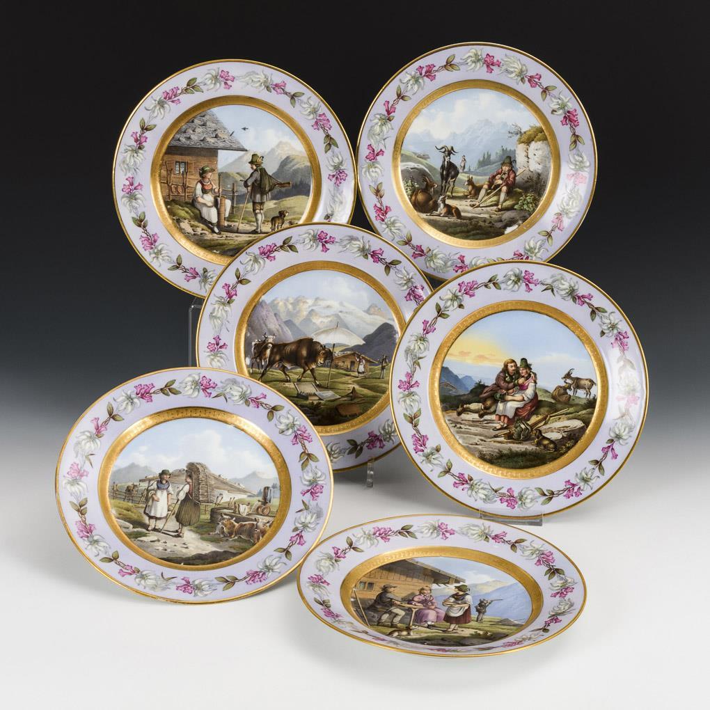 Flache Teller mit einem Blumenband mit Edelweiß auf dem violetten Fahnenfond, im Spiegel alpine Motive mit Figuren. Partiell minimaler Farb- bzw. Goldabrieb.