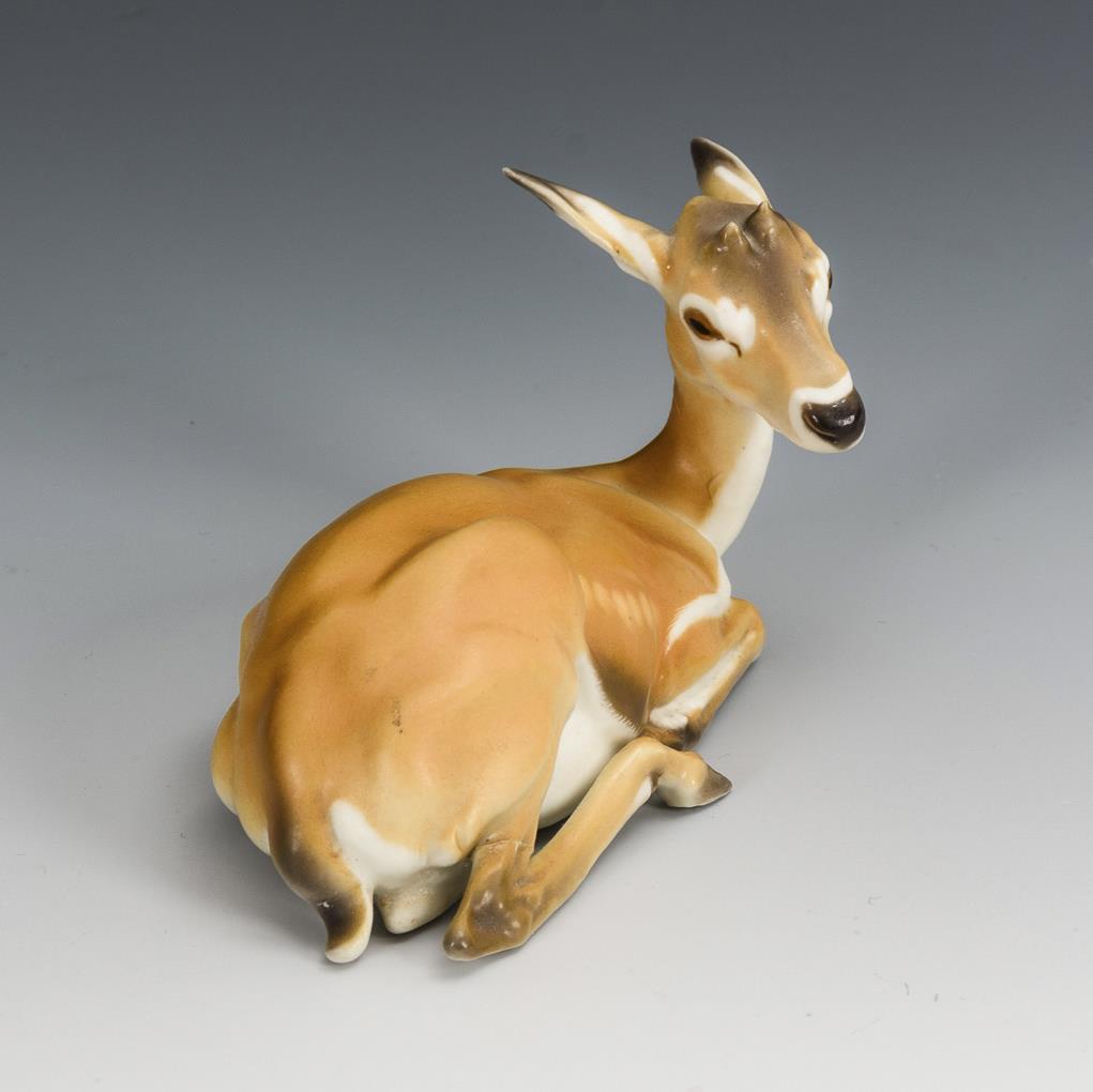 Liegende Gazelle. Rechter Hinterlauf geklebt, linke Ohrspitze minimal bestoßen.