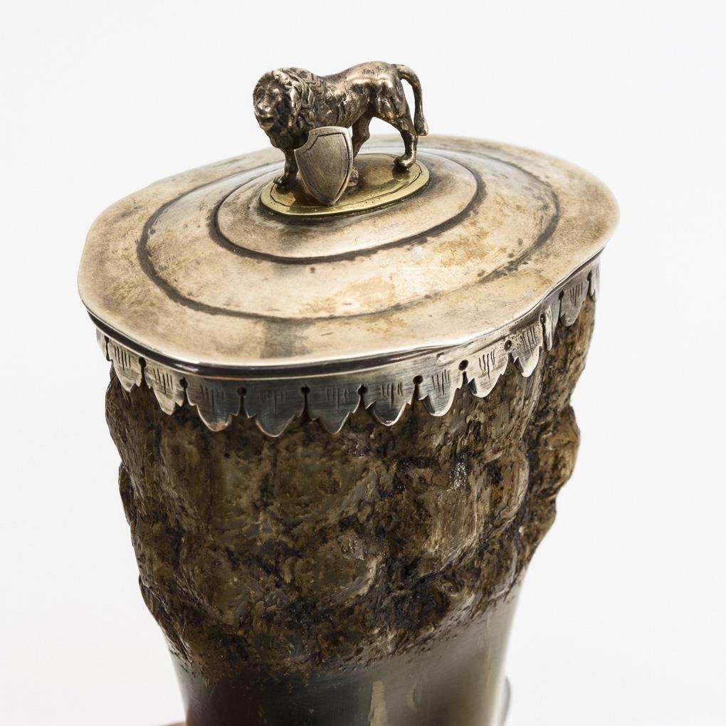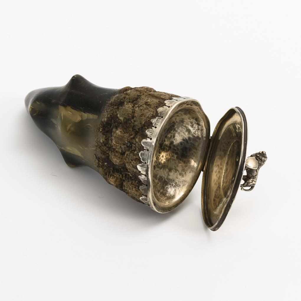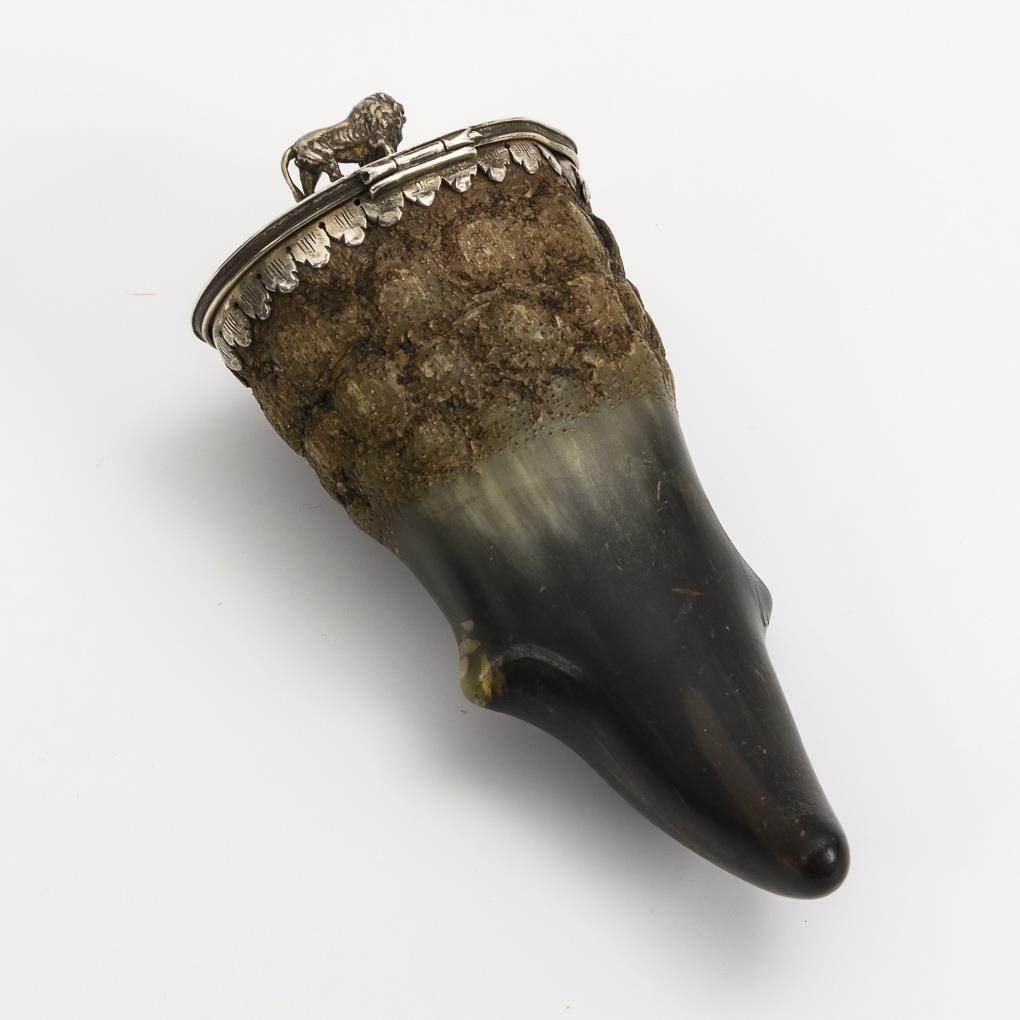 Polierte Spitze eines Horns (Steinbock?). Scharnierdeckel mit plastischem Löwenknauf über innen montierter Mulde. Geringe Alters-/Gebrauchsspuren.