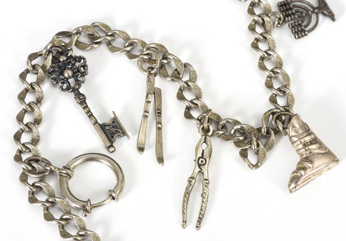 Kette mit verschiedenen Anhängern, darunter 7-armiger Leuchter, Skistiefel, Schlüssel und schwarz-weißes Fellstückchen.