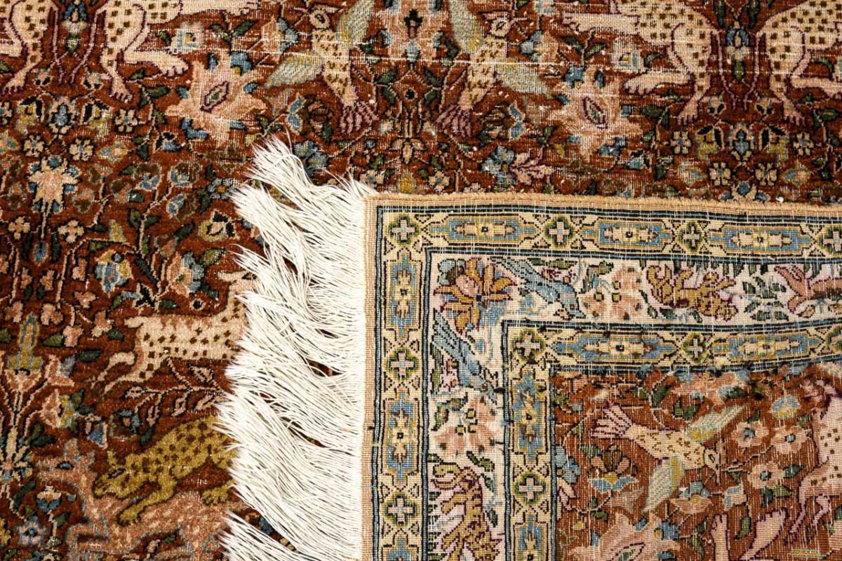 Im Endlosrapport durchmustertes Mittelfeld mit üppigen faunalen und floralen Motiven. Dreireihige Bordüre mit Kartuschenbändern und Tierdarstellungen. Beriebener Flor, leicht fleckig, Farben partiell leicht verwaschen.