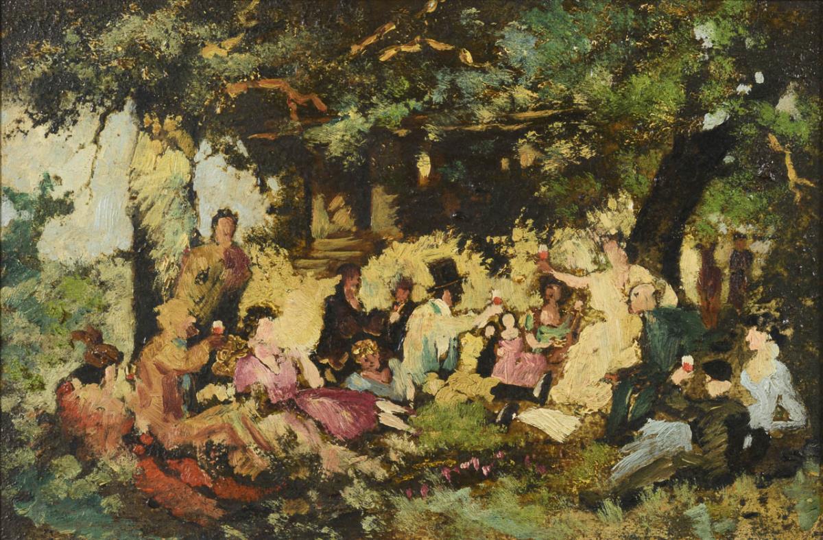 Ausgelassene Gartenfeier mit trinkender Gesellschaft unter Bäumen nahe der Laube.