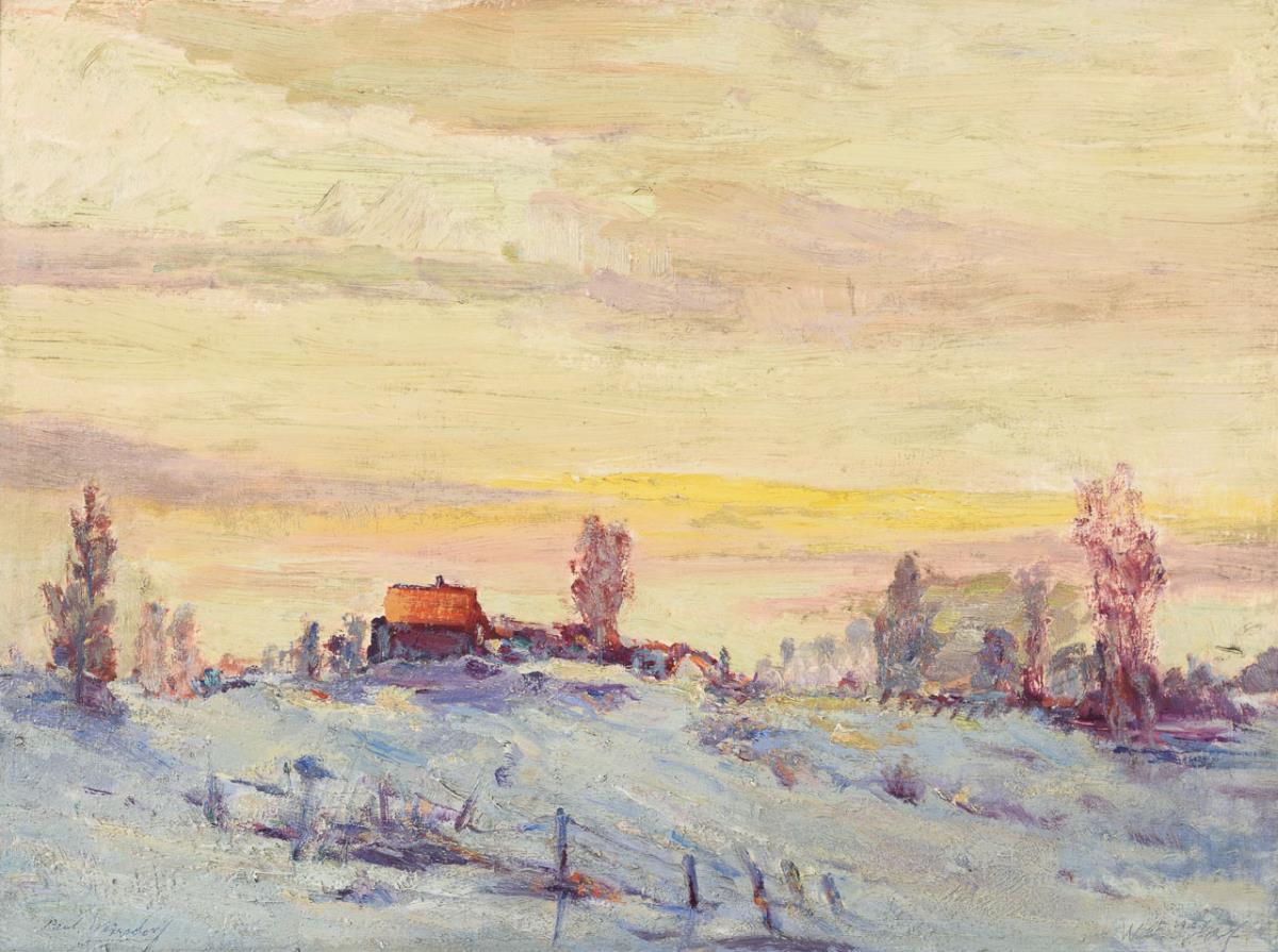 Verschneite hügelige Landschaft mit kleinem Haus bei tief stehender Sonne.
