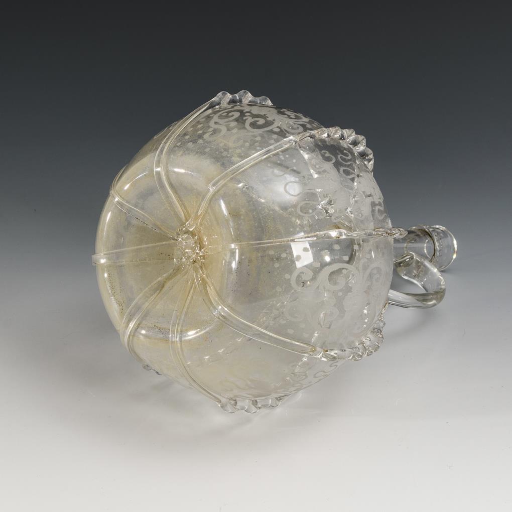 Kugelige Flasche mit Röhrenhals, zwei Henkeln, acht aufgeschmolzenen gekniffenen Bändern, Zwackelband am Hals und graviertem Dekor mit Wein und Vögeln.