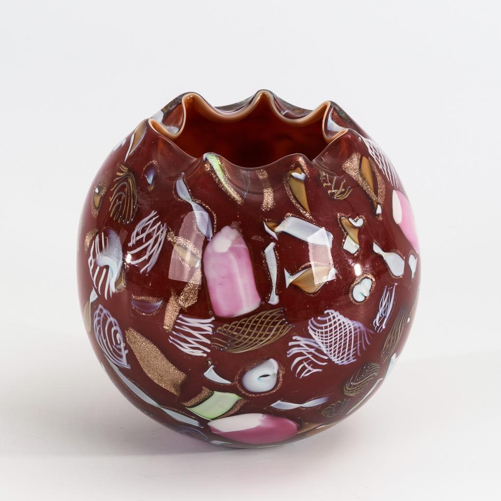 Farbloses Glas mit opalweißem und rotem Innenfang sowie in der Zwischenschicht eingeschmolzenen Fadennetzen, Millefiori-Canes und Kupferfolie.