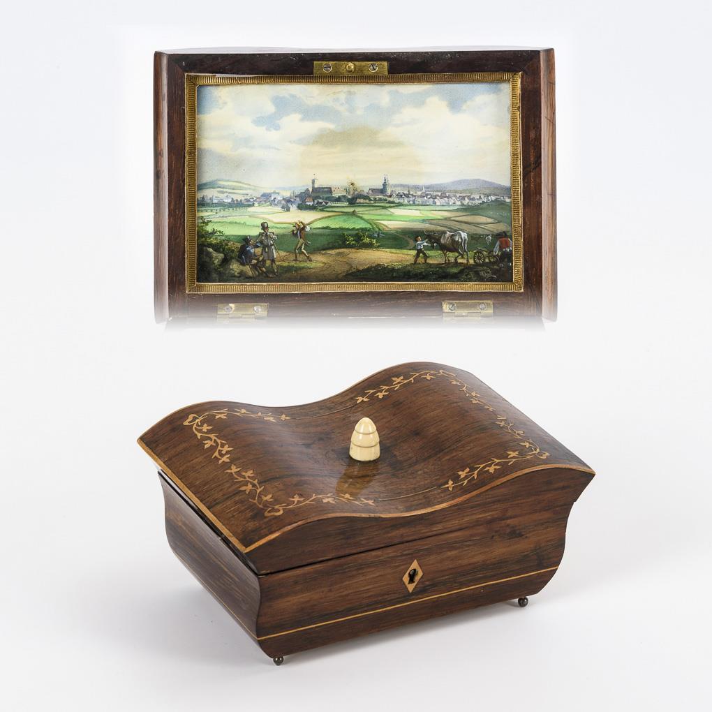 Geschweifter Korpus mit Blattranken-Marketerie; im Scharnierdeckel Stadtansicht mit Staffage. Alters-/Gebrauchsspuren, Fadeneinlagen teils ergänzt, Knauf wohl ergänzt.
