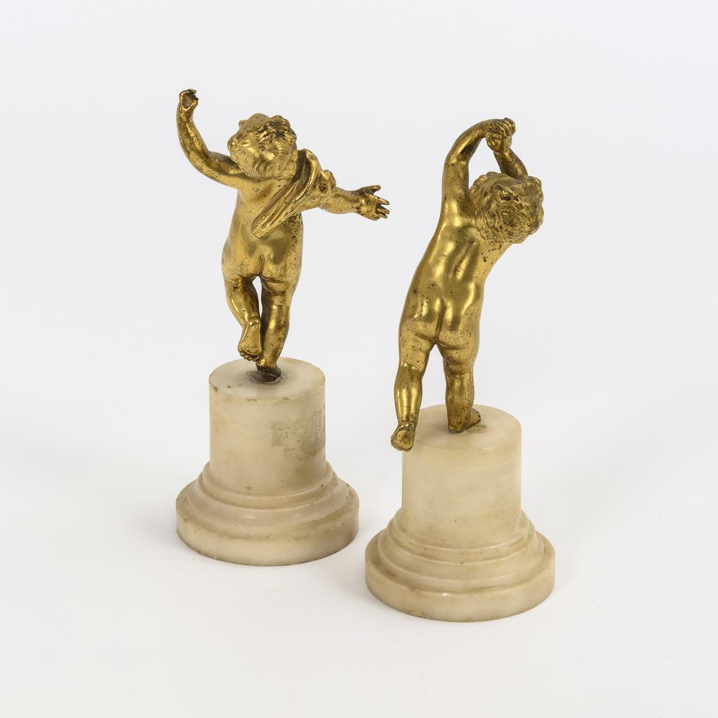 Bronze vergoldet, weiße Marmor-Postamente. Wohl 18. Jh. H je 11,5 / 18 cm.