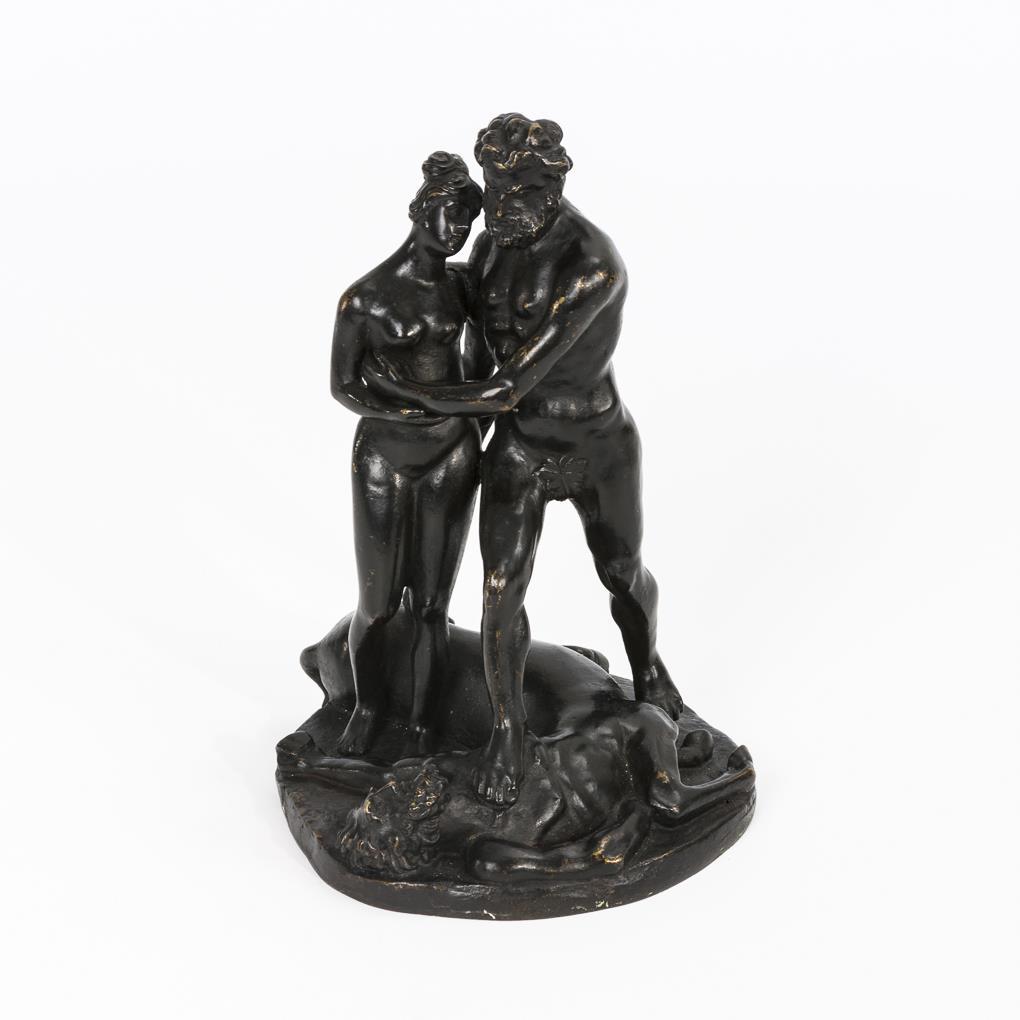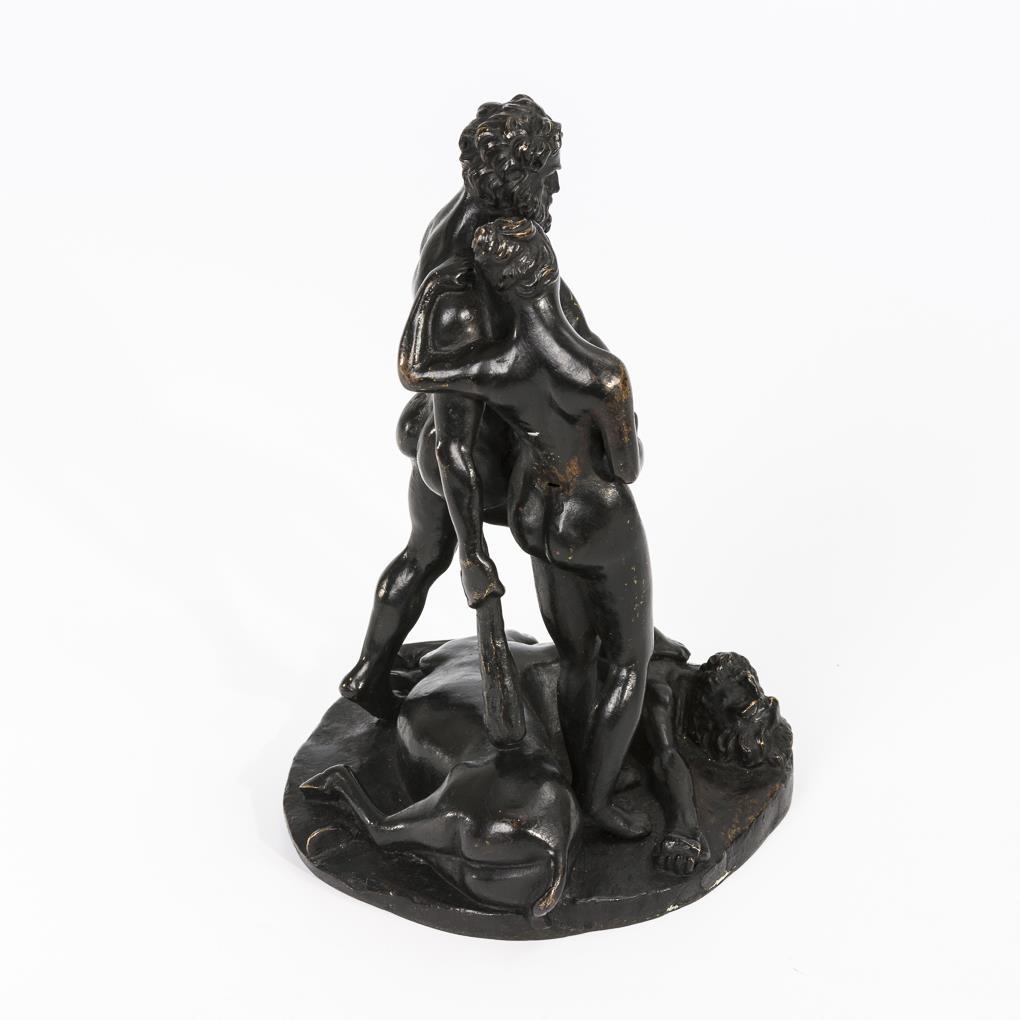 Stehende Aktfiguren von Herkules und Deianeira, wobei Herkules triumphierend ein Bein auf den getöteten Nessos stellt. Kleine Gussfehler, Patina berieben.