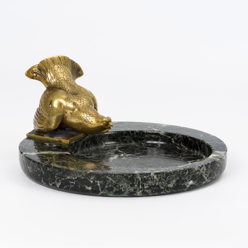 Schale mit exzentrischer Muldung; auf dem Rand der kollernde Hahn. Bronze etwas fleckig, Chips am Marmor.