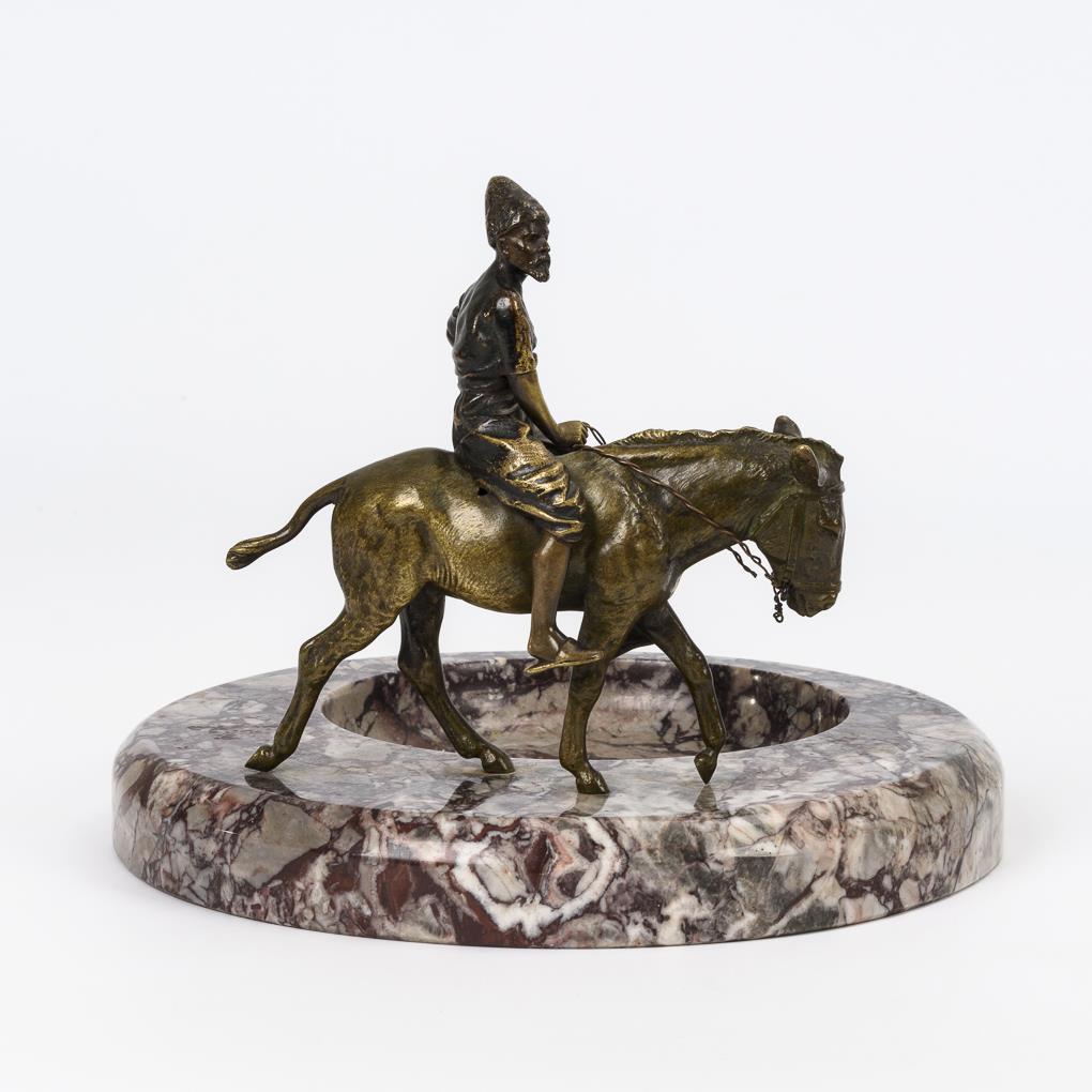 Schale mit exzentrischer Muldung; auf dem Rand die Reiterfigur (Wiener Bronze?). Patina berieben, Zügel gerissen.