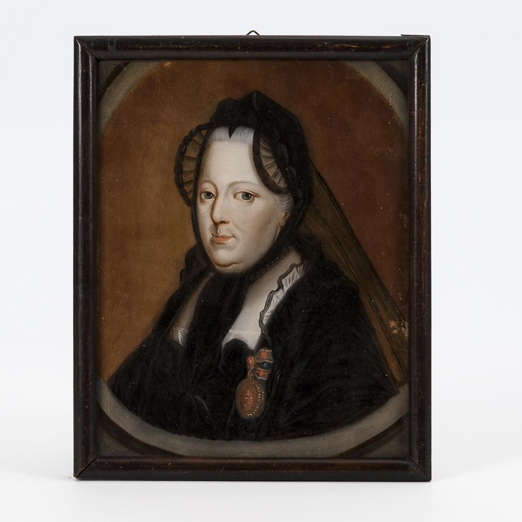 Porträt der Erzherzogin und Königin in schwarzer Witwentracht sowie mit dem Sankt-Stephans-Orden. Etwas Farbabrieb am Rand, beschnitten.