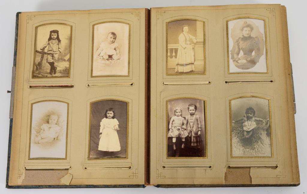 Porträtfotografien, oft aus dem französischsprachigen Raum, darunter viele Kinderbilder, wenig Uniform und Geistliche u. a.; 84, 62, 42 Fotos. Gründerzeitalben mit starken Gebrauchsspuren, teils defekt, im Samt- und Ledereinband.
