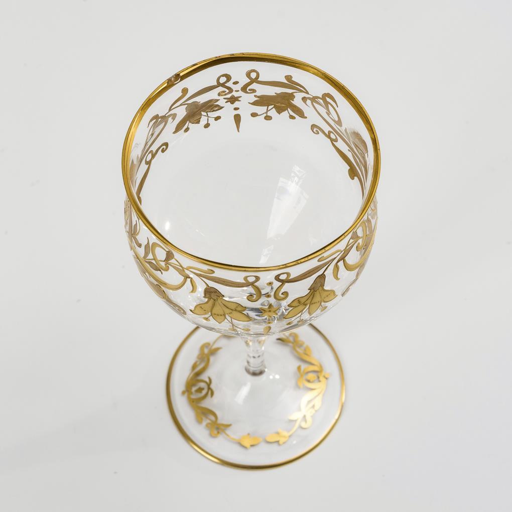 Farbloses, längsoptisch formgeblasenes Glas, teils reliefierte, vegetabile Goldmalerei. H 15 cm.