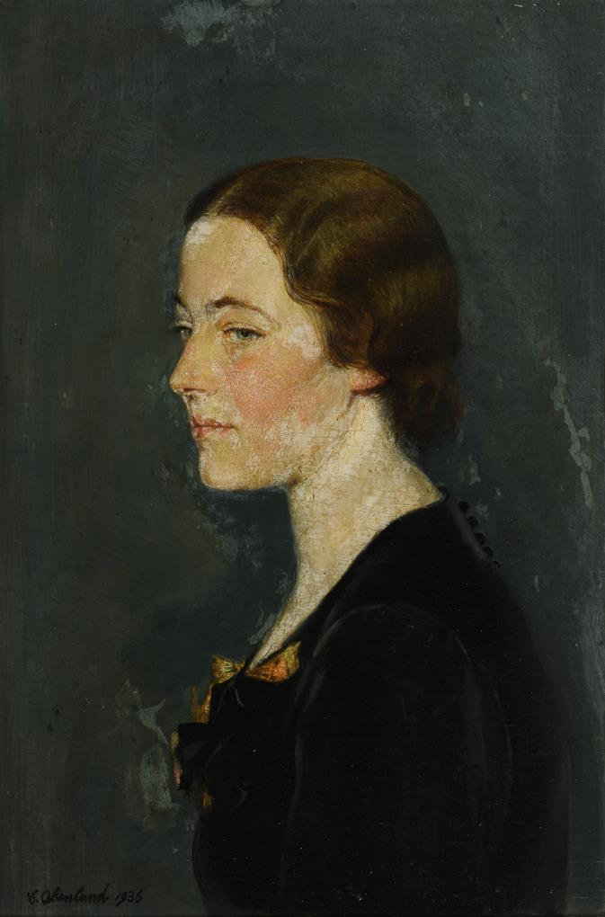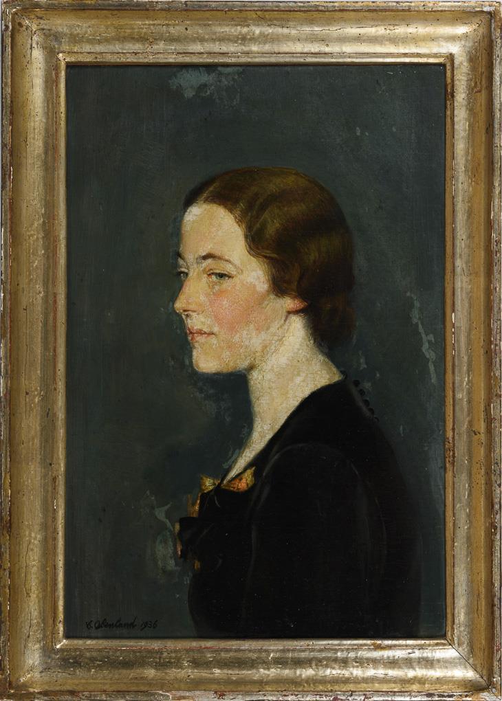 Profilbildnis einer jungen Frau im schwarzen Kleid vor blaugrauem Hintergrund. Altersspuren.