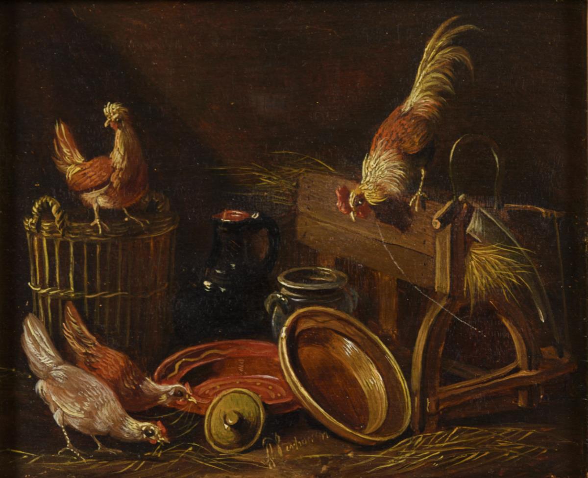 Das Federvieh zwischen Tellern und Krügen im Stall.
