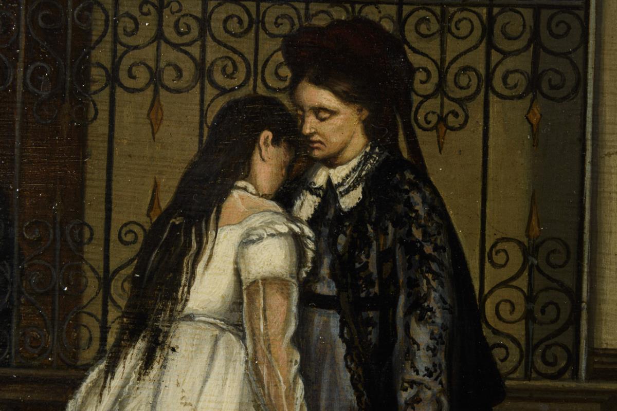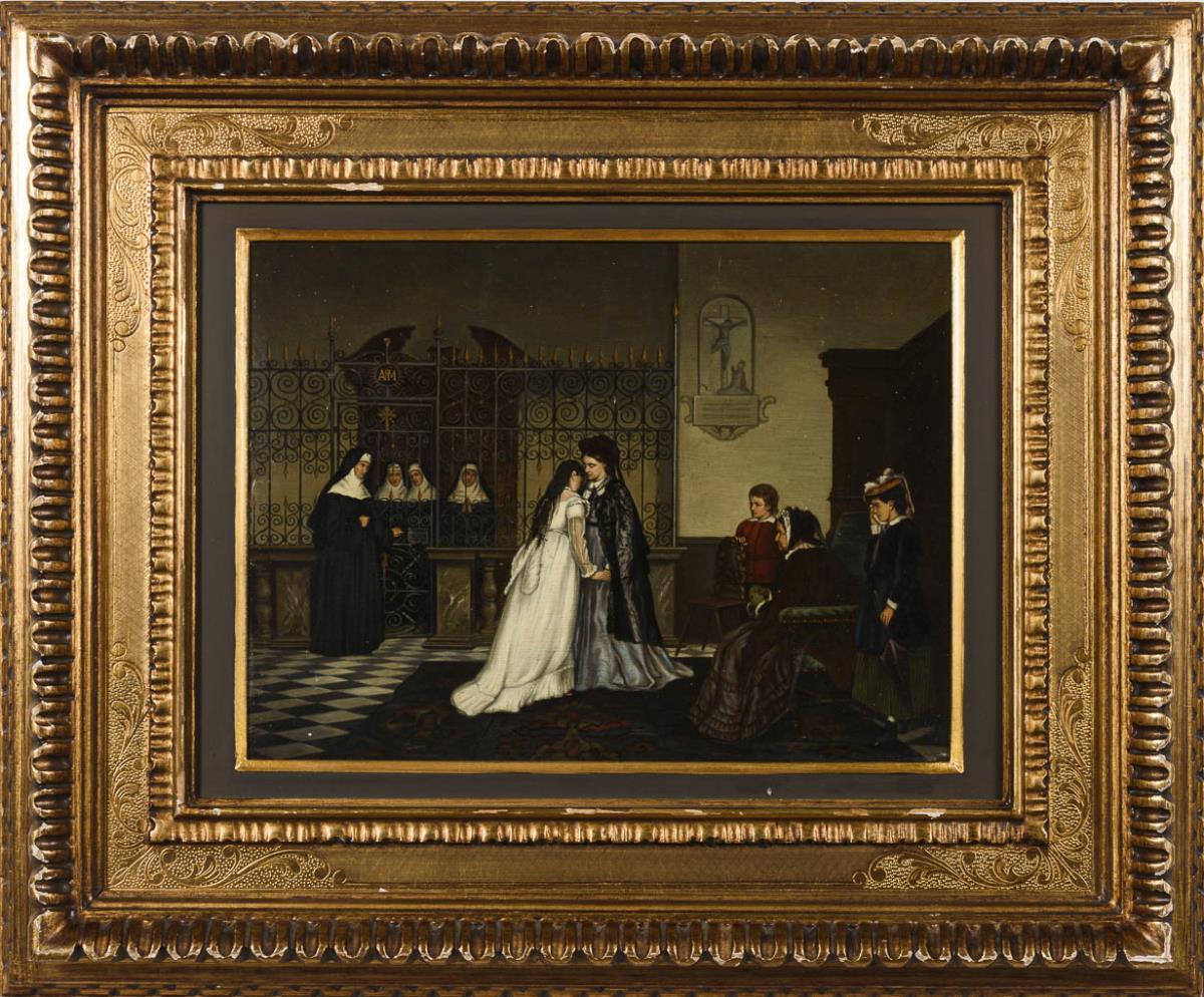 Junge Frau am Eingang des Klosters bei der Verabschiedung von der Familie. Ein kleiner Defekt.