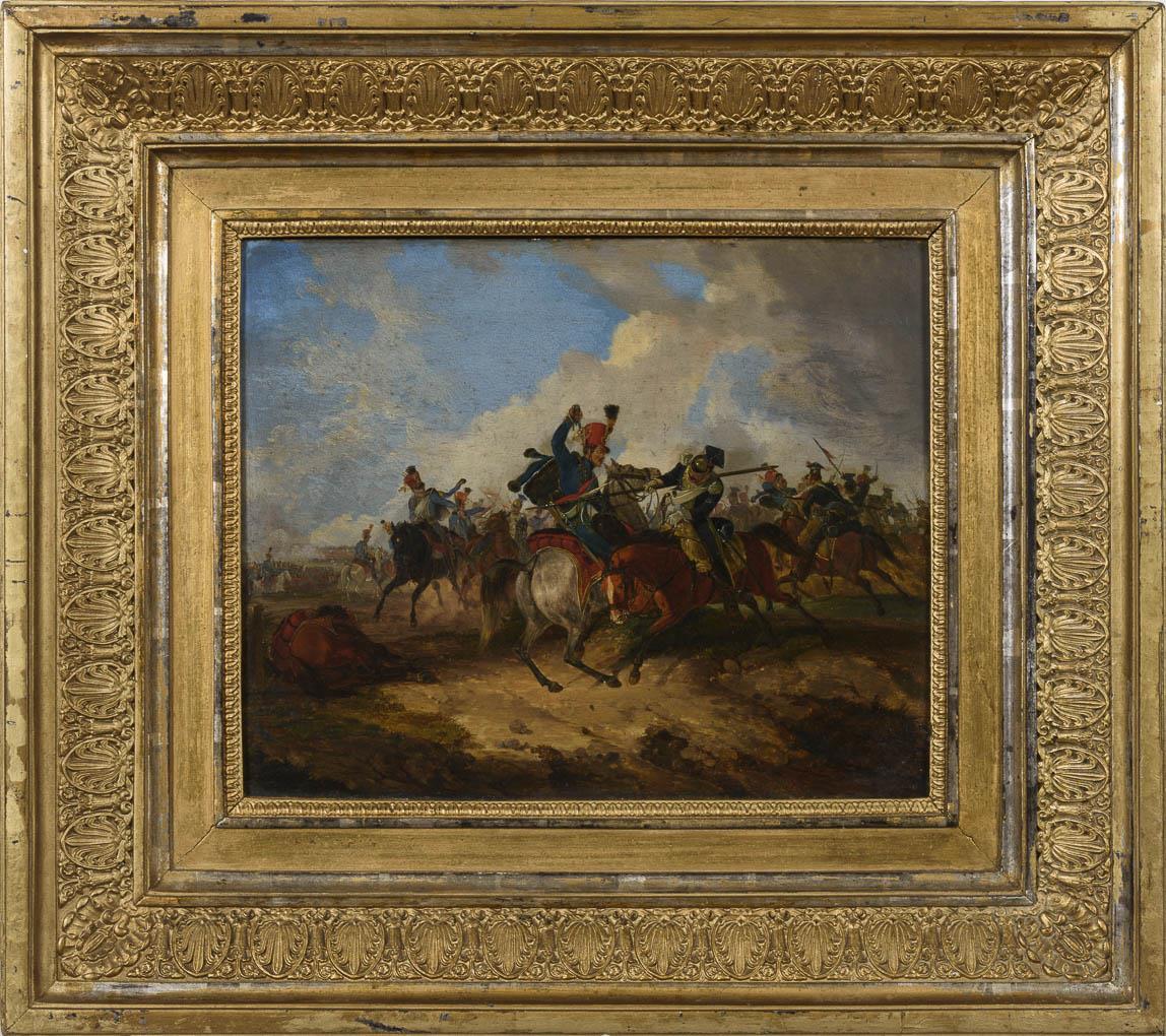 Reiter im hitzigen Gefecht auf weitem Feld unter wolkigem Himmel. Verso alter Klebezettel mit Inschrift von R. Wiegmann "Umstehendes Bild (...) von Dietrich Monten in München war vom hannoverschen Kunstverein angekauft zu 12 Louis d'or, habe ich mit meiner Aktie No. 871 gewonnen bei der Ausstellung im Jahre 1835 (...)". Leichte Altersspuren.