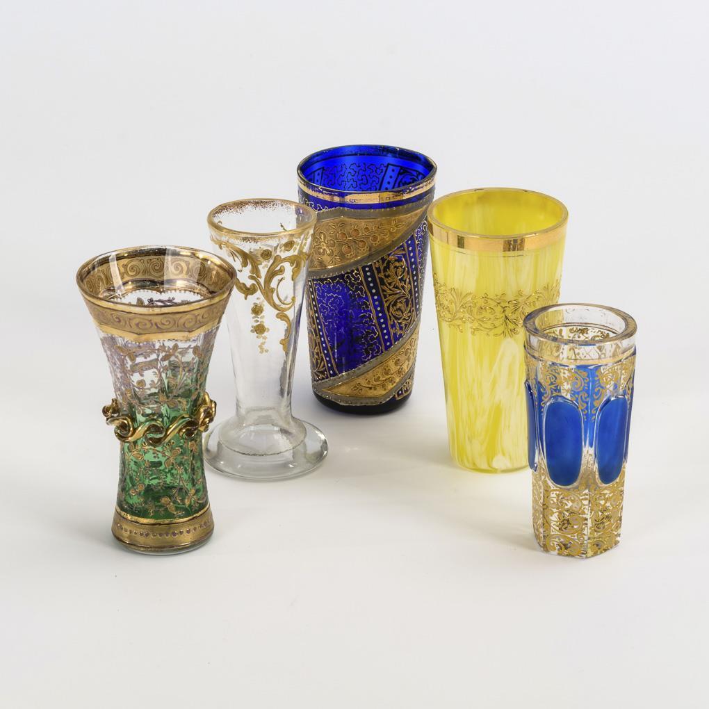 5 Likörgläser bzw. Vasen: 1x konisch aus farblosem Glas mit gelb-opalweißem, verlaufendem Innenfang. / 1x schlanke Kraterform mit grünem Verlauf und aufgeschmolzenem Wellenband. / 1x konisch aus kobaltblauem Glas (dieses unterseitig signiert "2716 Moser D2/L". / 1x schrägoptisch geblasen mit Rundfuß. / 1x sechsfach facettiert mit hochgeschliffenen Medaillons. Alle mit ornamentaler, teils reliefierter Goldmalerei. Gold partiell berieben.