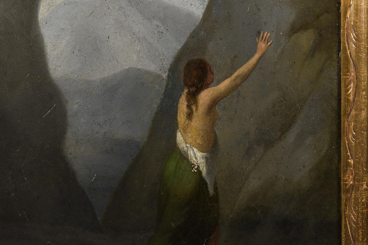 Klassizistische Darstellung des Szene aus Ovids Metamorphosen mit dem am Wasser knienden halbnackten Jüngling, der sich in sein eigenes Spiegelbild verliebt. Über ihm Amor, der ihn mit einem Pfeil beschießt, weiter hinten die von Narziss zuvor verschmähte Echo. Leinwand doubliert.