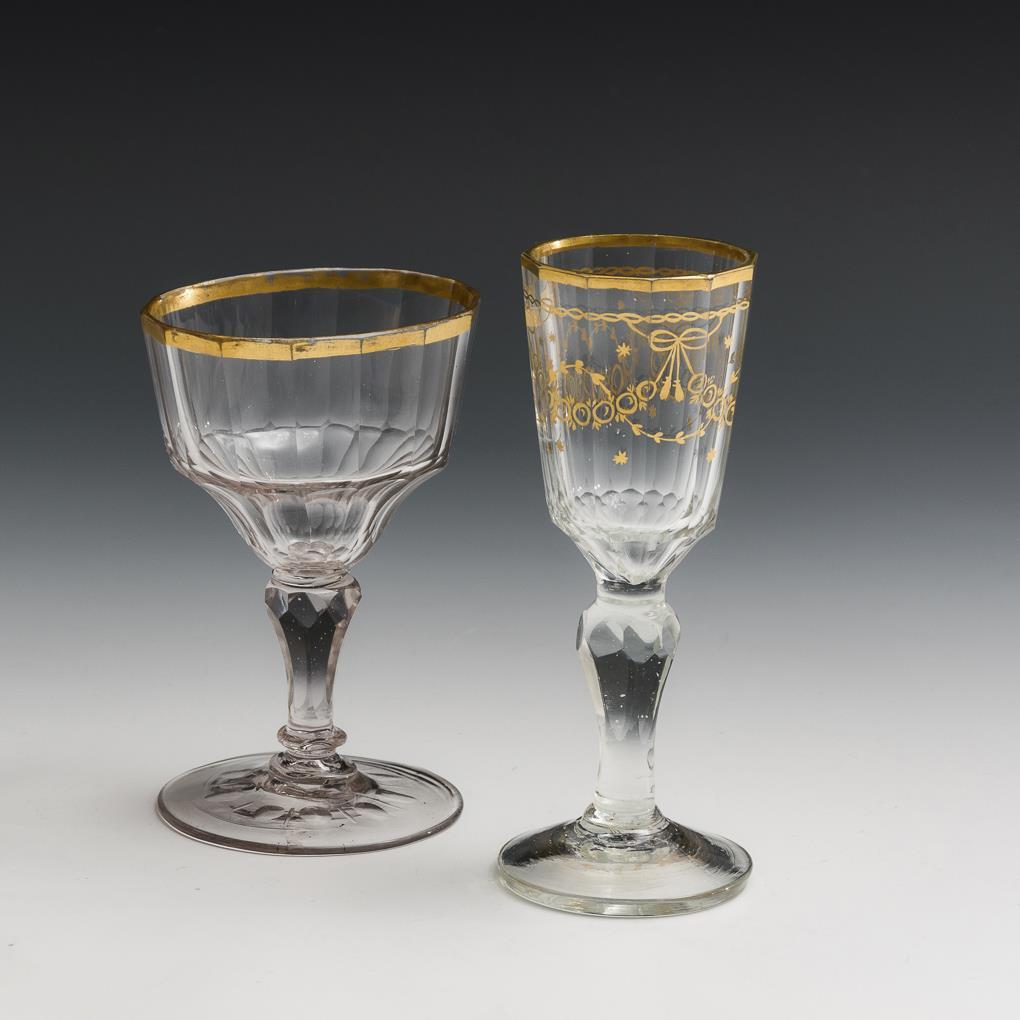 Mehrfach facettierte, am Ansatz eingezogene Kuppa, Balusterschaft, Rundfuß. Beide mit Goldrand, 1x mit vegetabiler Goldmalerei. Partieller Goldabrieb, 1x kleiner Spannungsriss am Fußrand.