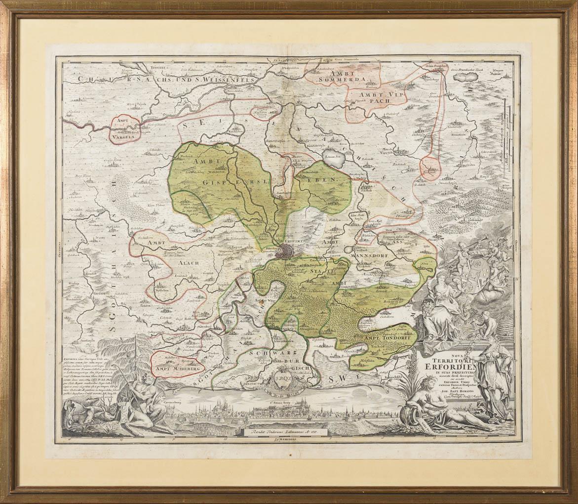 Landkarte mit der thüringischen Stadt Erfurt im Mittelpunkt, bezeichnet "Nova Territorii Erfordiensis in suas Praefecturas accurate divisi descriptio cui accedit Erfordiae Urbis exterior Facies eet Prospectus", mit großer, figurenreicher Titelkartusche und zentralperspektivischer Ansicht von Erfurt im unteren Bereich. Bugfalte, stockfleckig.