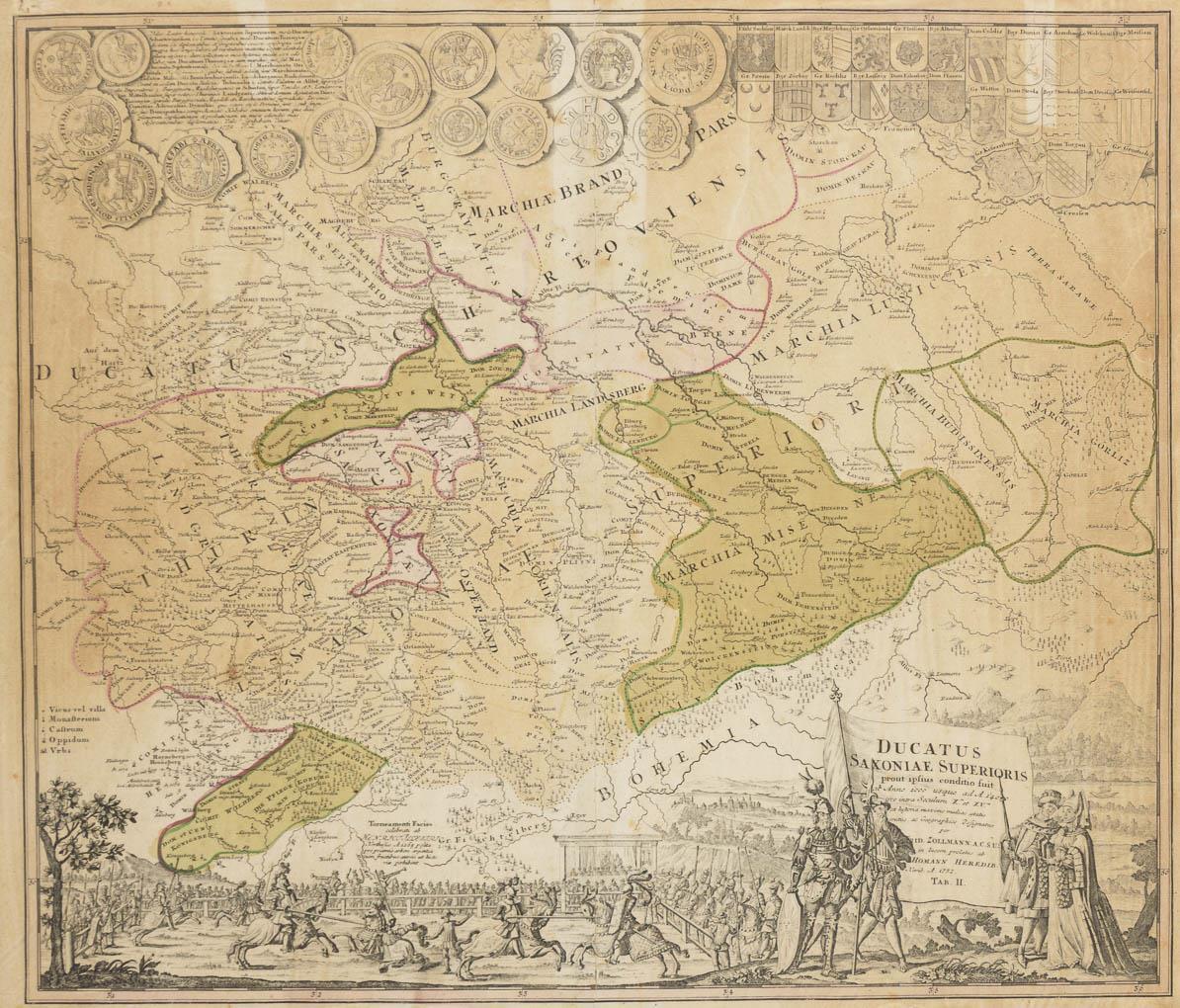 Geschichtskarte des thüringisch-sächsischen Gebietes mit Herrschaftsgebieten zwischen dem 11. und 15. Jh., mit verschiedenen Wappen und Siegeln sowie Darstellung eines Ritterturniers, figürliche Titelkartusche, bezeichnet: "Ducatus Saxoniae Superioris prout ipsius condition fuit ab Anno 1000 usque 1400 [...]"; Entwurf des Archivars, Historikers und Kartografs Friedrich Zollmann (1690 Gotha - 1762 Weimar). Bugfalte, Lichtschaden, etwas stockfleckig.
