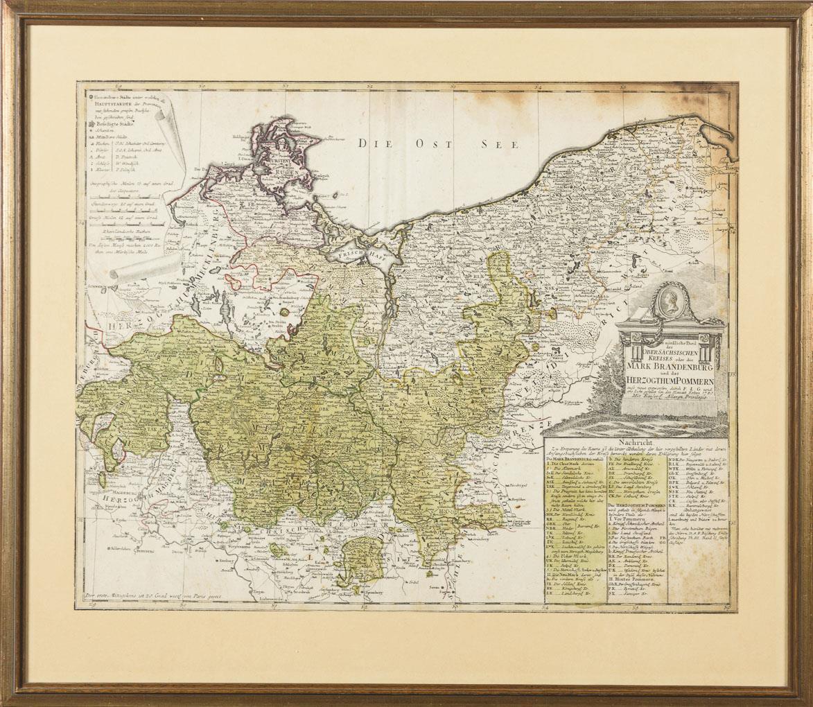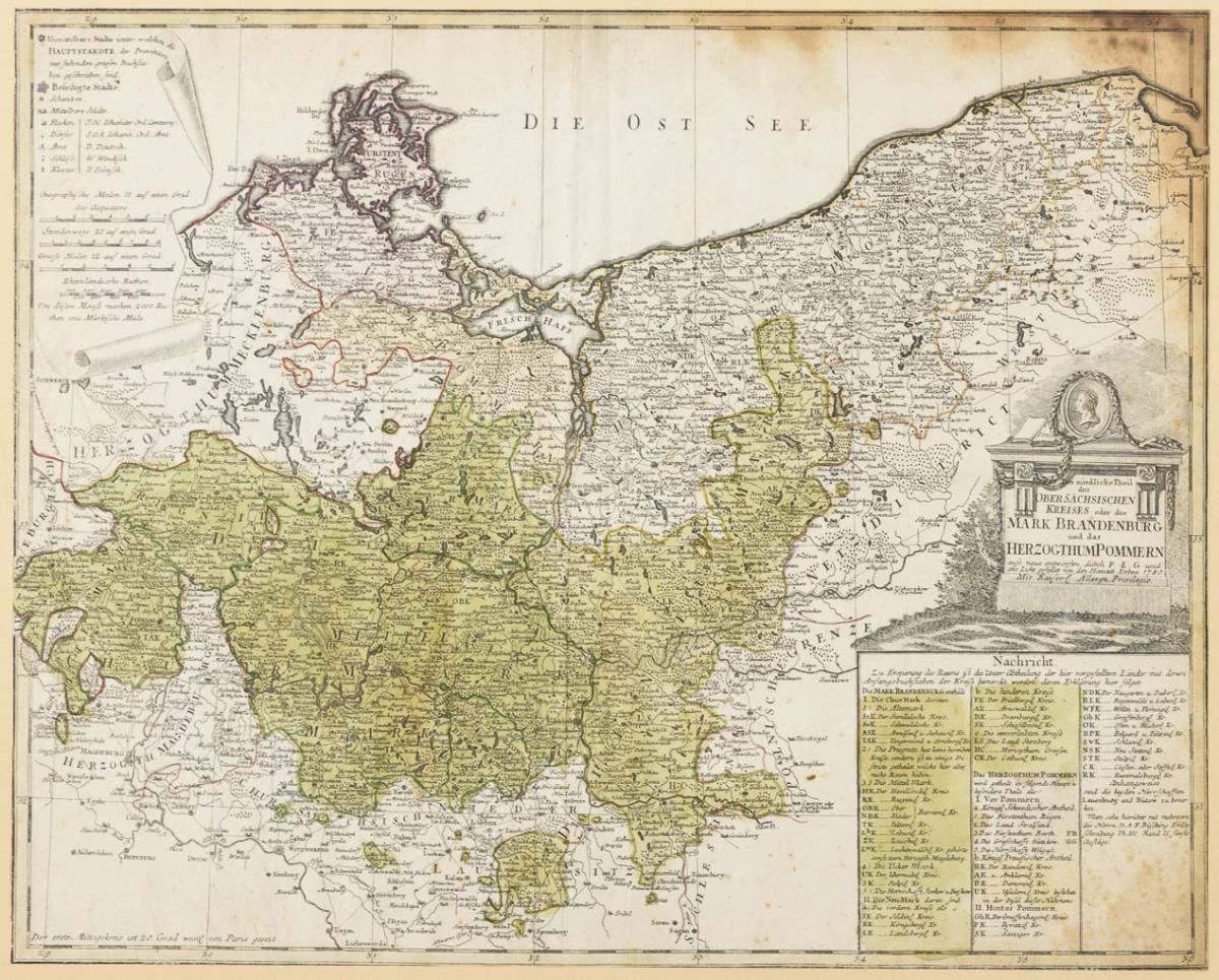 Topografische Karte der Mark Brandenburg und des Herzogtums Pommern, bezeichnet: "Der nördliche Theil des obersächsischen Kreises oder die Mark Brandenburg und das Herzogthum Pommern [...]", mit Titelkartusche und ausführlicher Legende. Bugfalte, Beschnitten, am Rand stark stockfleckig.