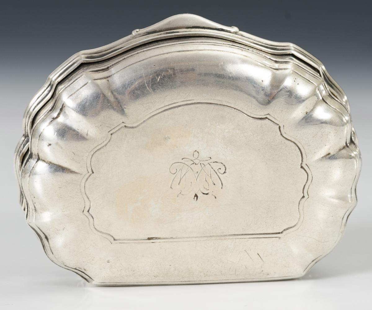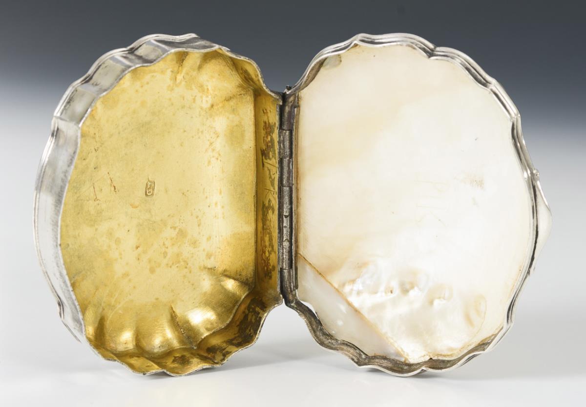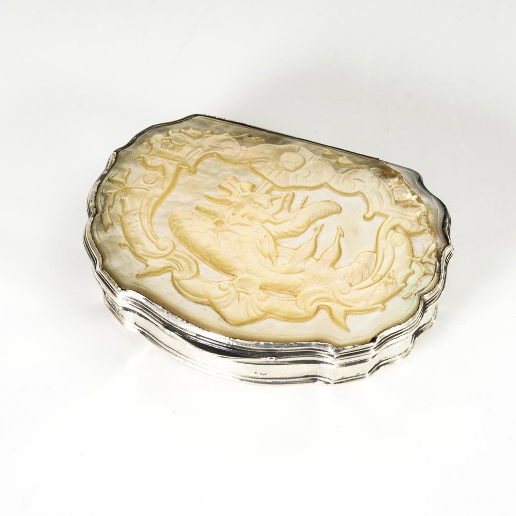 Passige Form mit undeutlichem, wohl mythologischem Deckelbild (Frau und 2 Kraniche). Unterseitig verschlungene Monogrammgravur „WW“. Perlmutt am Rand repariert, Oberfläche stark abgegriffen.
