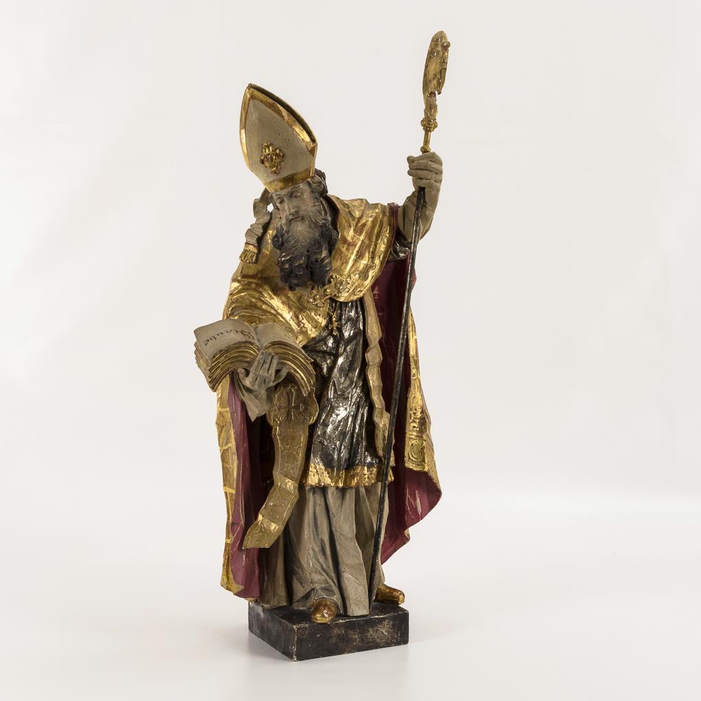 In barocker Bewegtheit und Faltenfülle gestaltete Figur des Bischofs mit Krummstab und Buch. Auf dem Buch eine Beschriftung: "Wo Glaube". Alters-/Gebrauchsspuren.