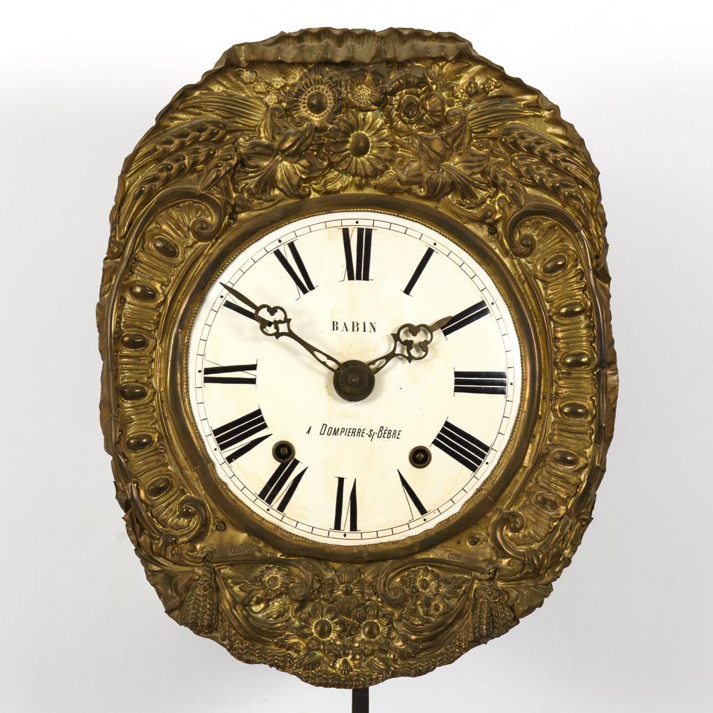Messingräderwerk mit Ankergang und Halbstundenschlag auf Tonfeder. Funktion nicht geprüft. Weißes Emailzifferblatt mit römischen Zahlen, Minutenkranz und dreipassigen Messingzeigern. Herstellerprägung Anzeige: "Babin, a Dompierre-s/-Bèbre".