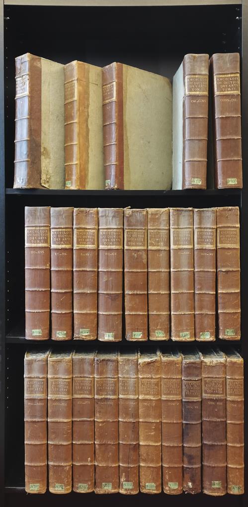 19 Textbände in nicht ganz stringenter Alphabetisierung, da es immer wieder Nachträge gab. In diesen Bänden nur vereinzelt Abbildungen bzw. Vignetten oder Faltblätter. Je Band zwischen 800 und 1000 Seiten. / 5 Bände mit Abbildungen "Recuell de Planches sur les science, les arts liberaux et les arts mechaniques", hier sind ausführlich gestaltete Kupferstichtafeln zu den behandelten Themen zu finden. (Band IV - IX, herausgegeben zwischen 1774 und 1778). Bei vielen Bänden handelt es sich um eine 3. Auflage die zeitnah, aufgrund der hohen Nachfrage von Charles Joseph Panckoucke (dem damals einflußreichsten Verlerger Frankreichs), in Originalgröße herausgegeben wurde. Goldgeprägte Halbledereinbände mit marmoriertem Schnitt . Altersspuren, die Rücken der Abbildungsbände sind meist etwas eingerissen. Nur gelegentlich Flecke oder Risse in den Blocks. Alles in allem ein guter Zustand für diese Folianten.