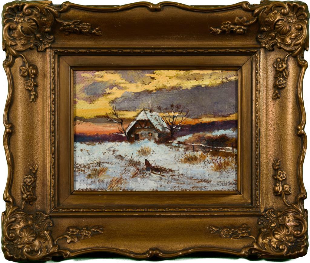 Bauernkate im Winter mit nahender Staffagefigur.