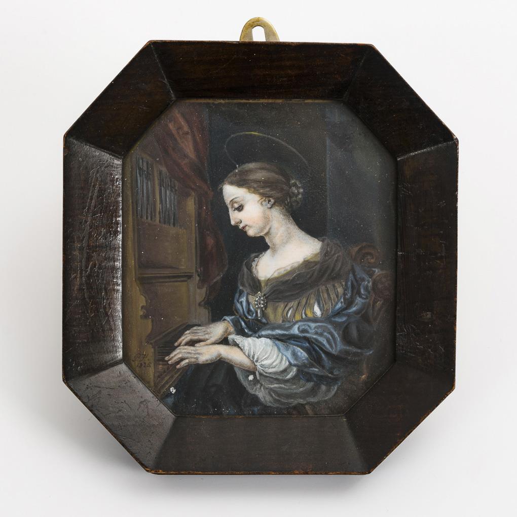 Miniatur: Heilige Cäcilia beim Orgelspiel.