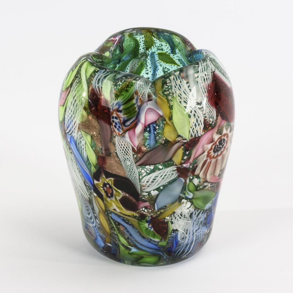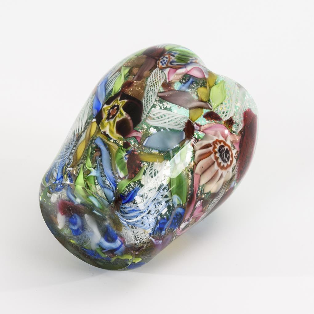 Farbloses, dickwandiges Glas mit transparentgrünem Innenfang, eingeschmolzene, bunte Millefiori-Canes, Kupferstab, Fadennetze sowie gesprengte Silberfolie. H 11 cm.